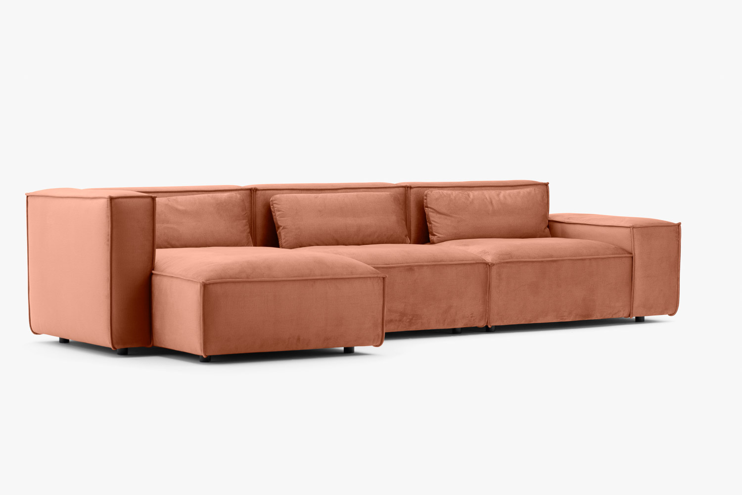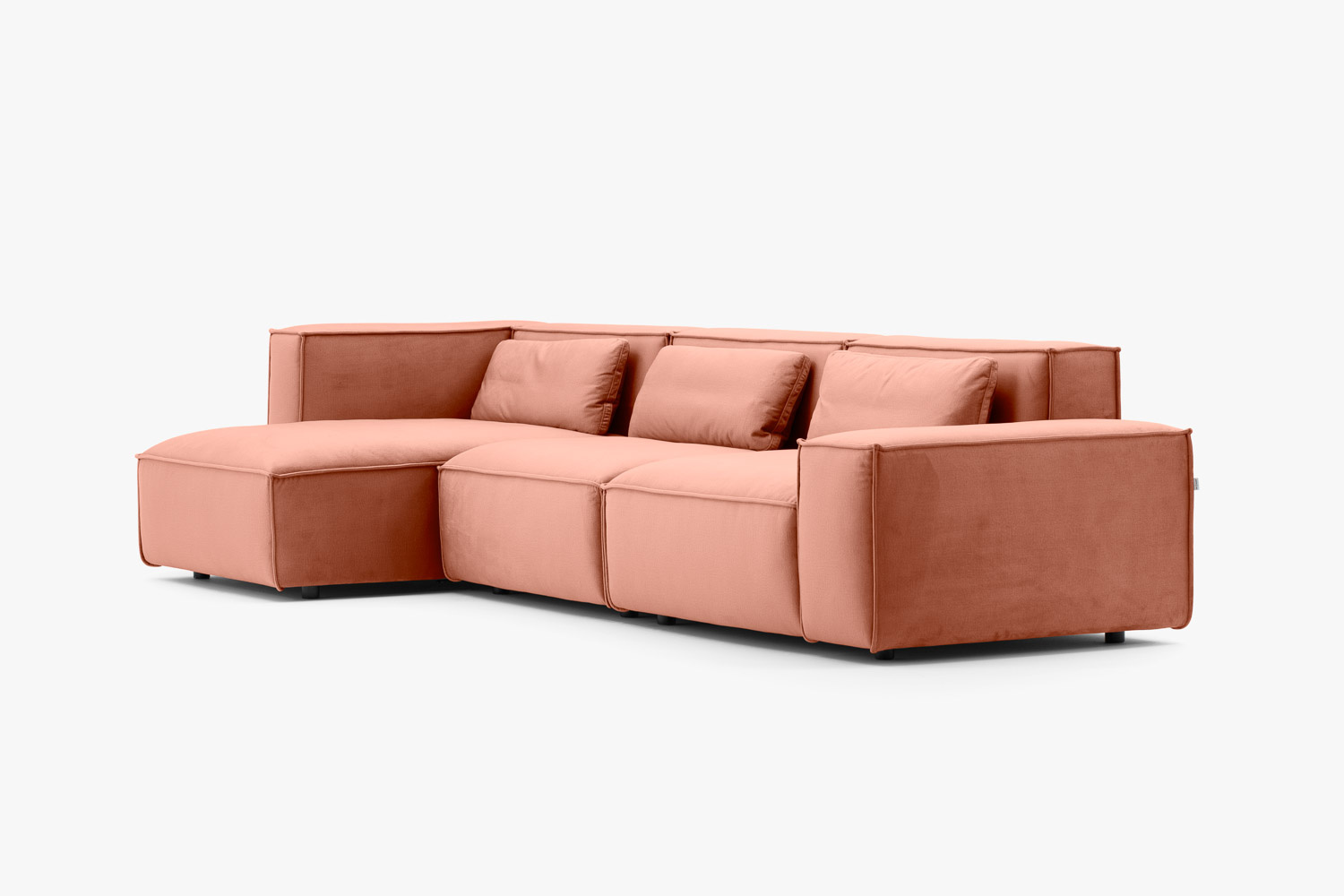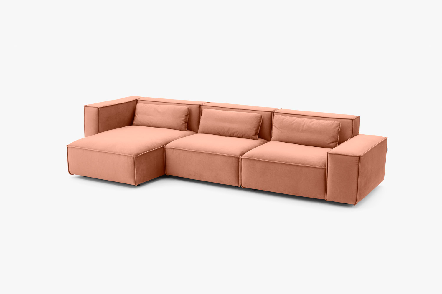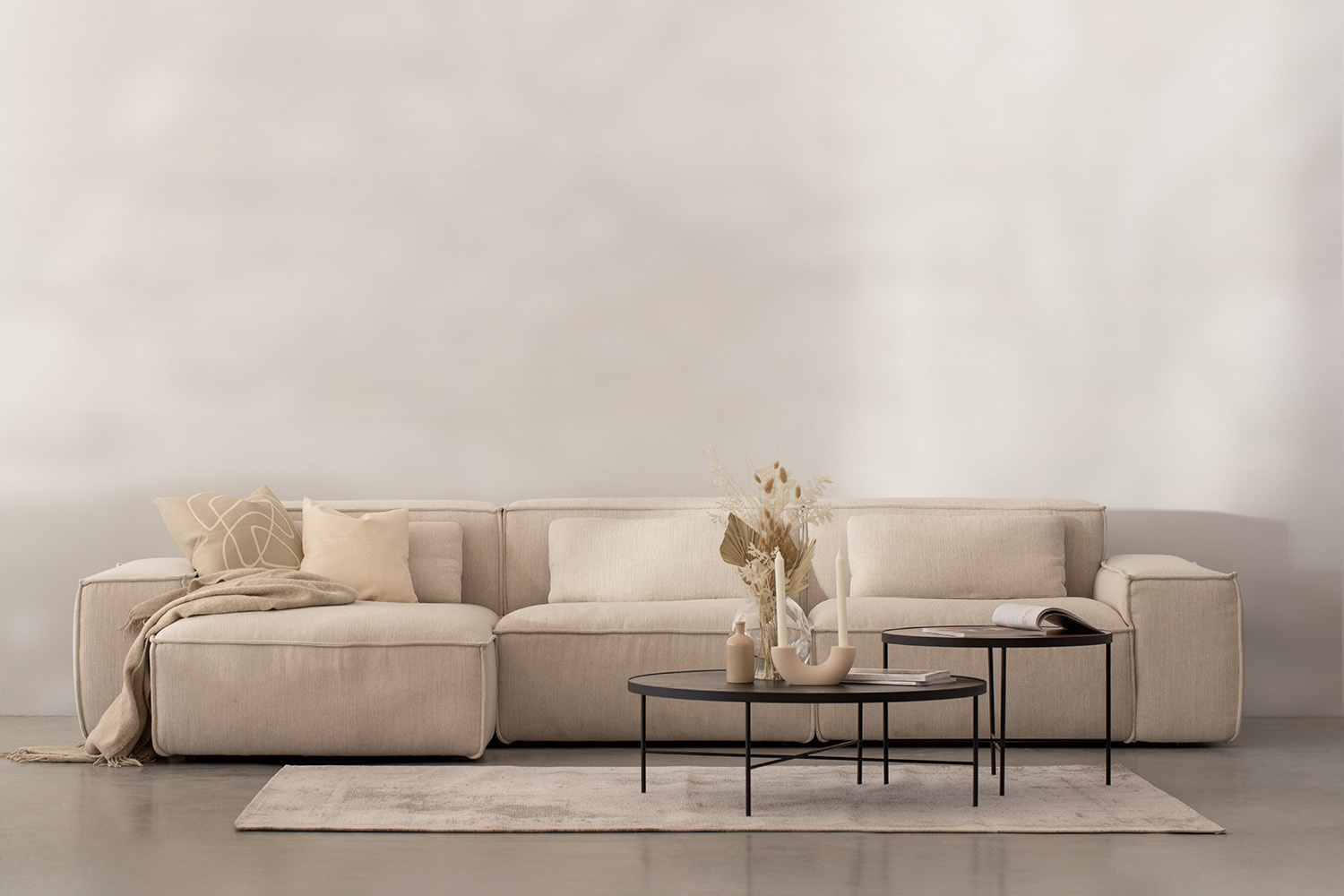 Die Verwendung einer dekorativen Naht in jedem Modul unterstreicht die quadratische Form und verleiht der Kollektion ein gemütliches Aussehen.