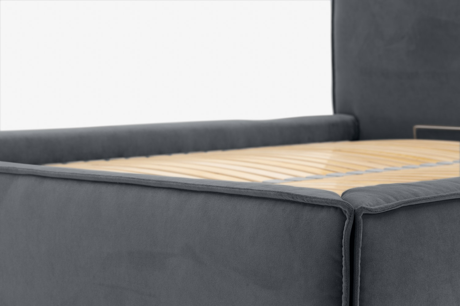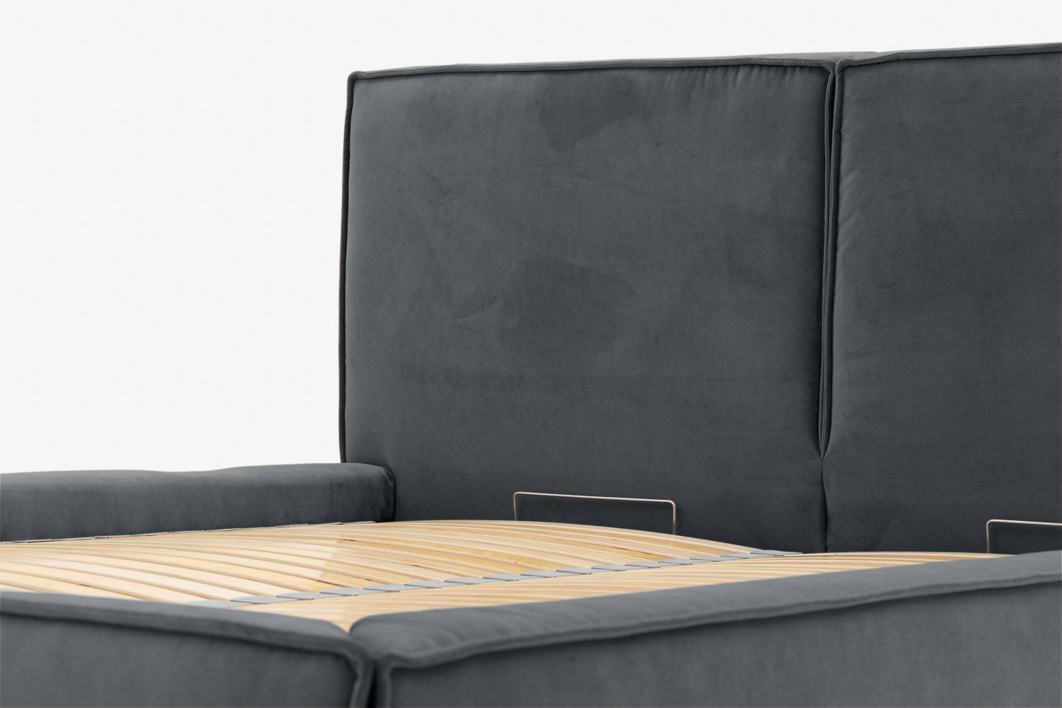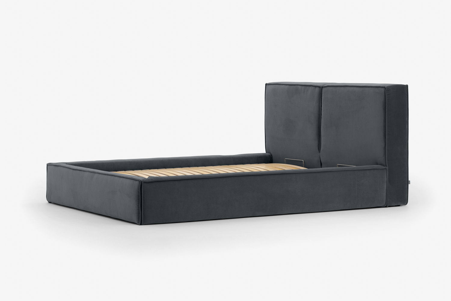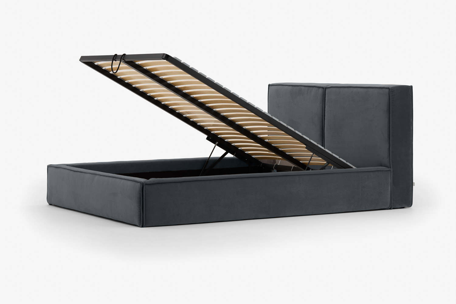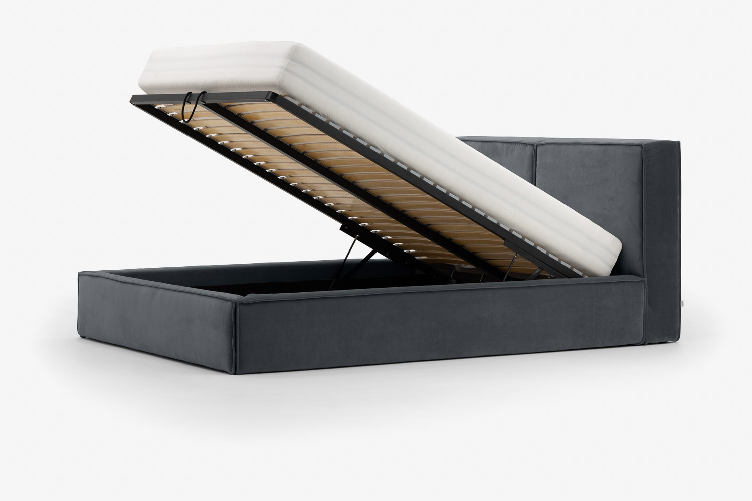Der Vorteil des Bettes liegt in der funktionalen Nutzung des Raumes unter dem Möbel, in dem sich ein großer und geräumiger Bettzeugbehälter verbirgt.