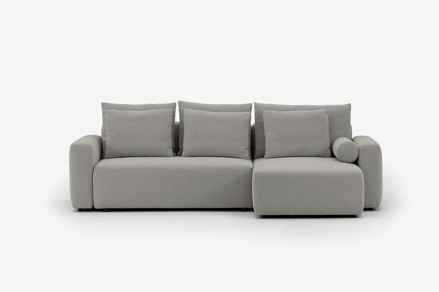 Der Vorteil des Ecksofas mit dem Aufklappsystem DL ist die funktionelle Nutzung des Raums unter der Sitzfläche, wo sich ein großer und geräumiger Bettzeugbehälter verbirgt.