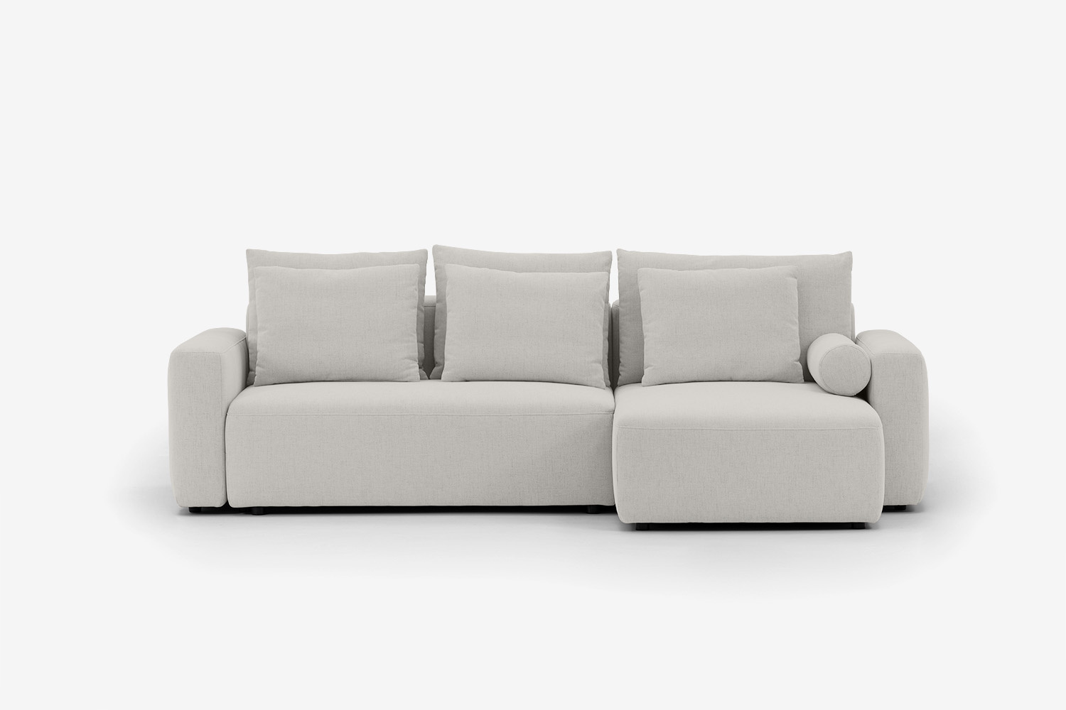 Der Vorteil des Ecksofas mit dem Aufklappsystem DL ist die funktionelle Nutzung des Raums unter der Sitzfläche, wo sich ein großer und geräumiger Bettzeugbehälter verbirgt.