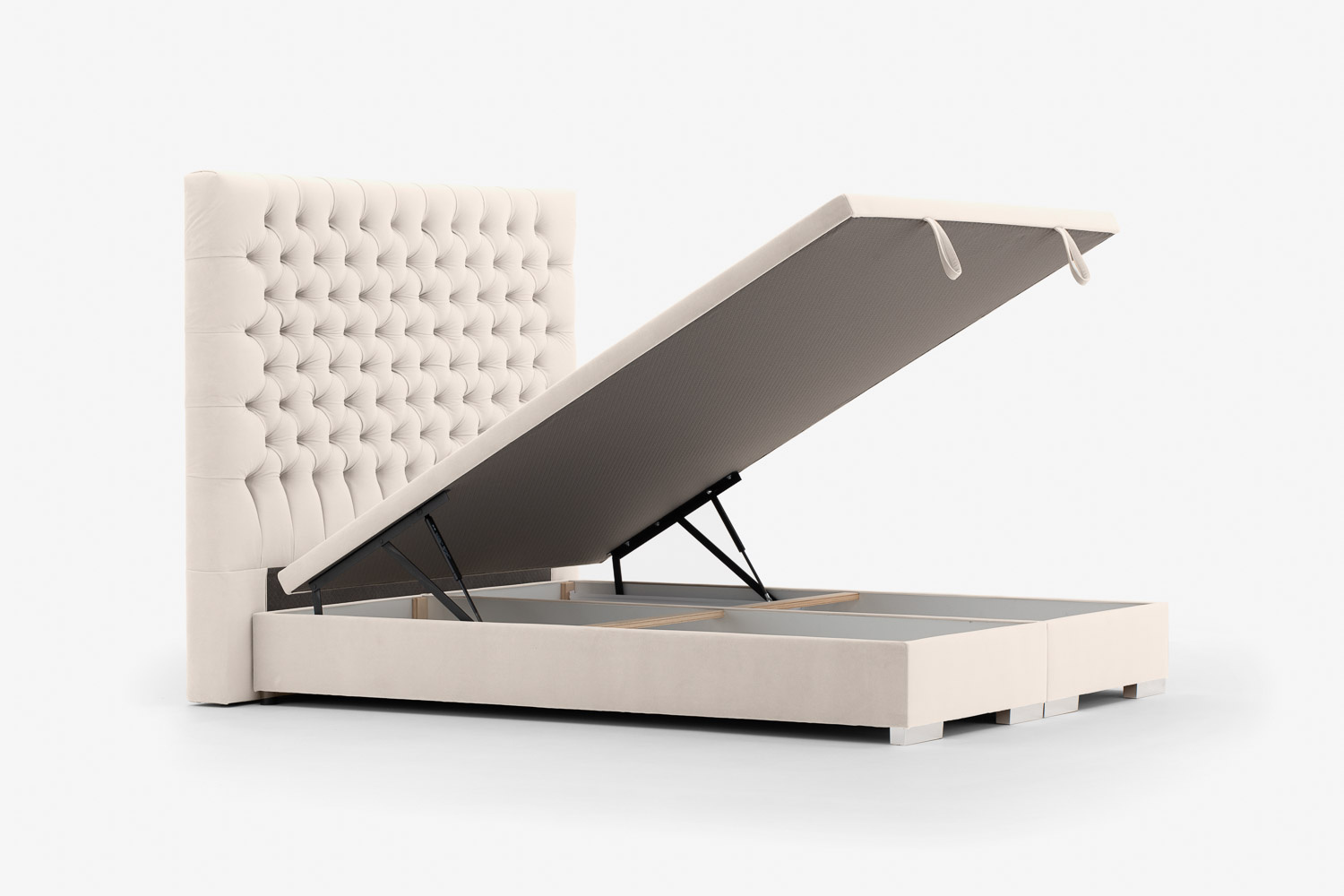 Das Bett ist mit einem großen Bettzeugbehälter ausgestattet, der über Gasdruckfedern geöffnet wird. Der Vorteil des kontinentalen Bettes ist, dass es keinen Seitenrahmen hat, so dass es keine harten Holzkanten gibt.