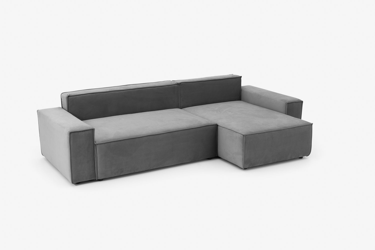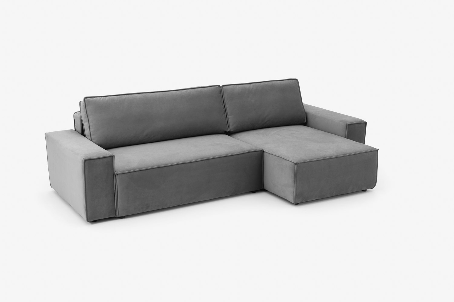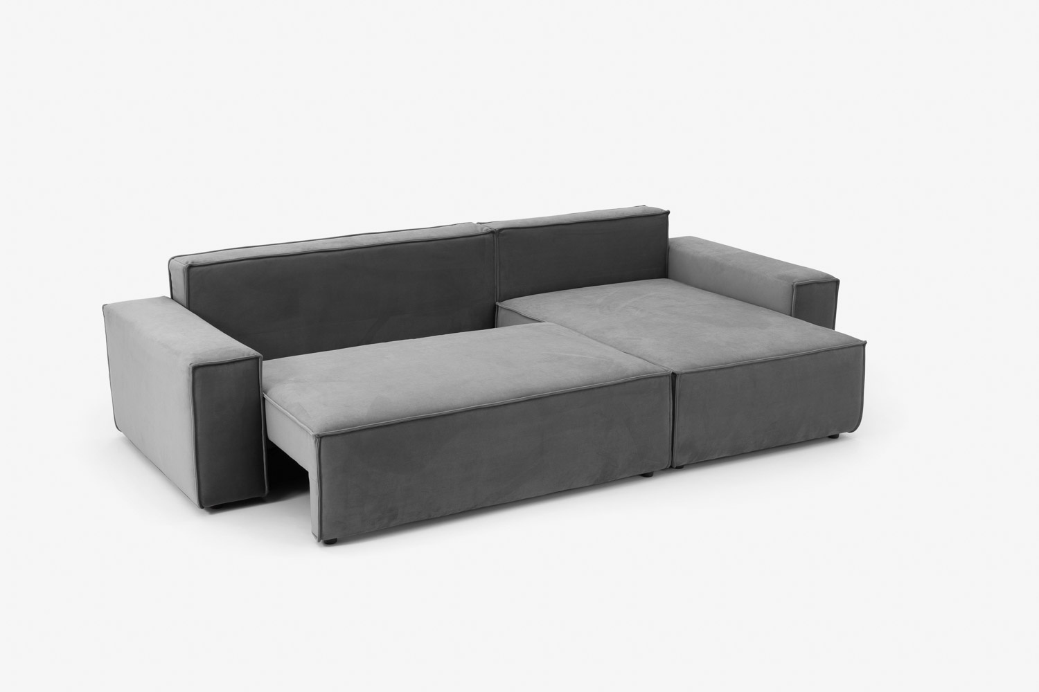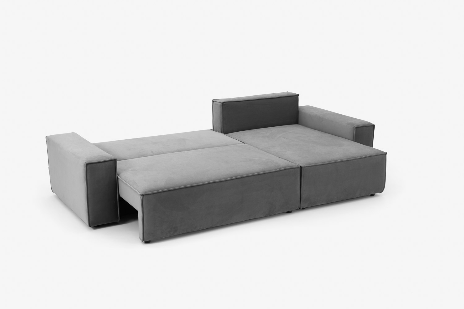 Der Vorteil des Ecksofas mit dem Aufklappsystem DL ist die funktionelle Nutzung des Raums unter der Sitzfläche, wo sich ein großer und geräumiger Bettzeugbehälter verbirgt.