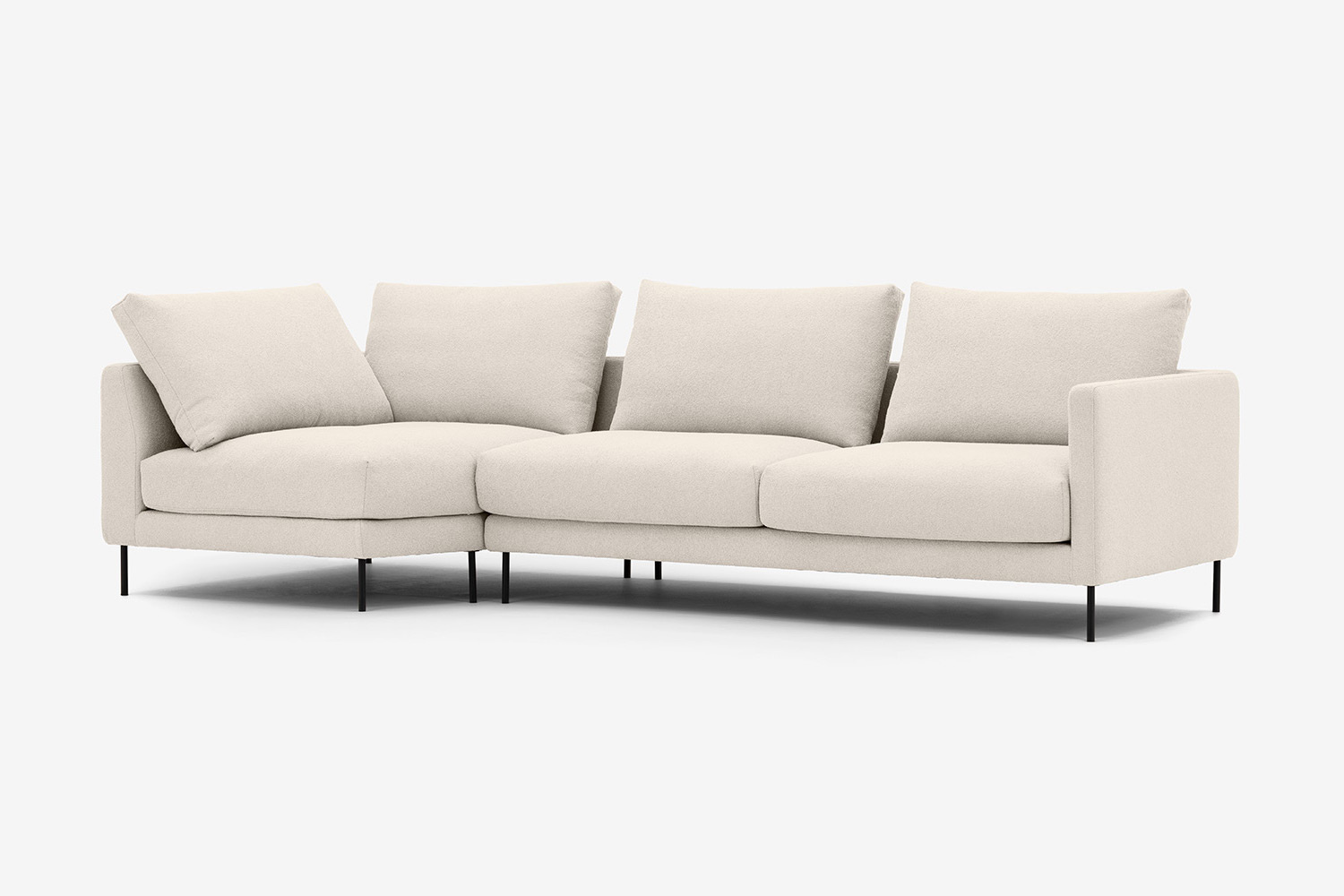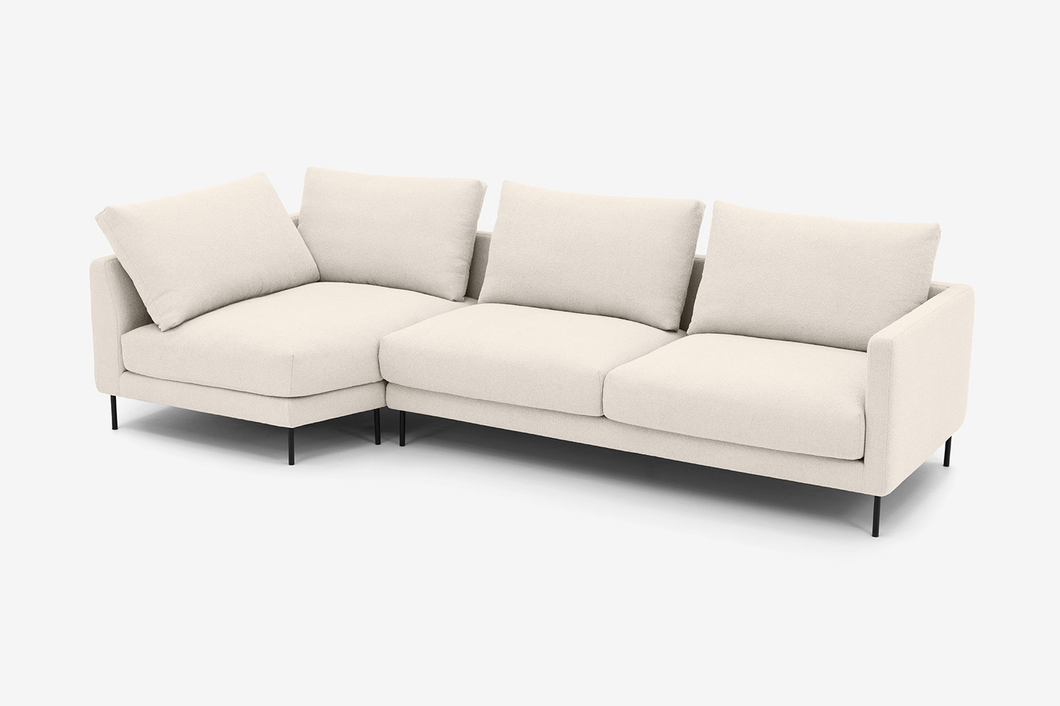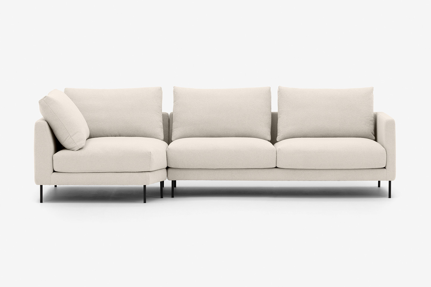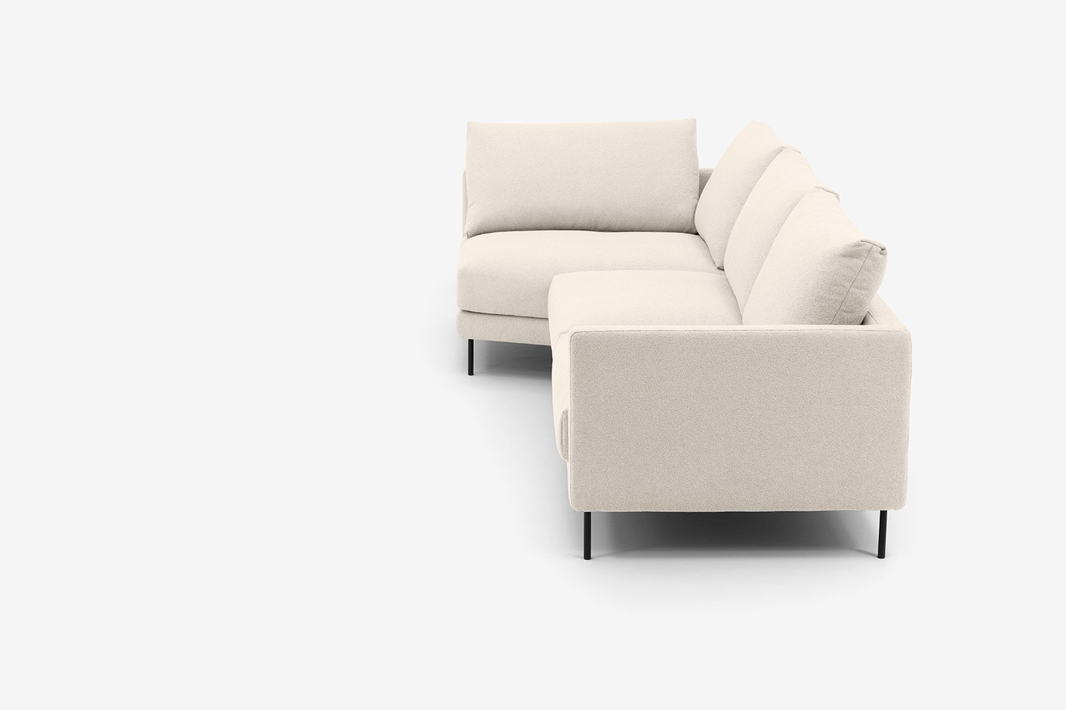 Die Beine des Ecksofas sind aus schwarzem Metall, und dank ihrer Höhe ist die Reinigung unter dem Möbel einfach und angenehm. Dies ist sehr vorteilhaft für die Einfachheit des täglichen Gebrauchs, trägt aber auch zu seiner Eleganz bei.