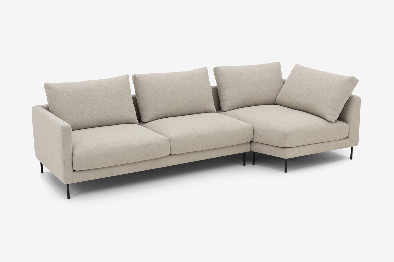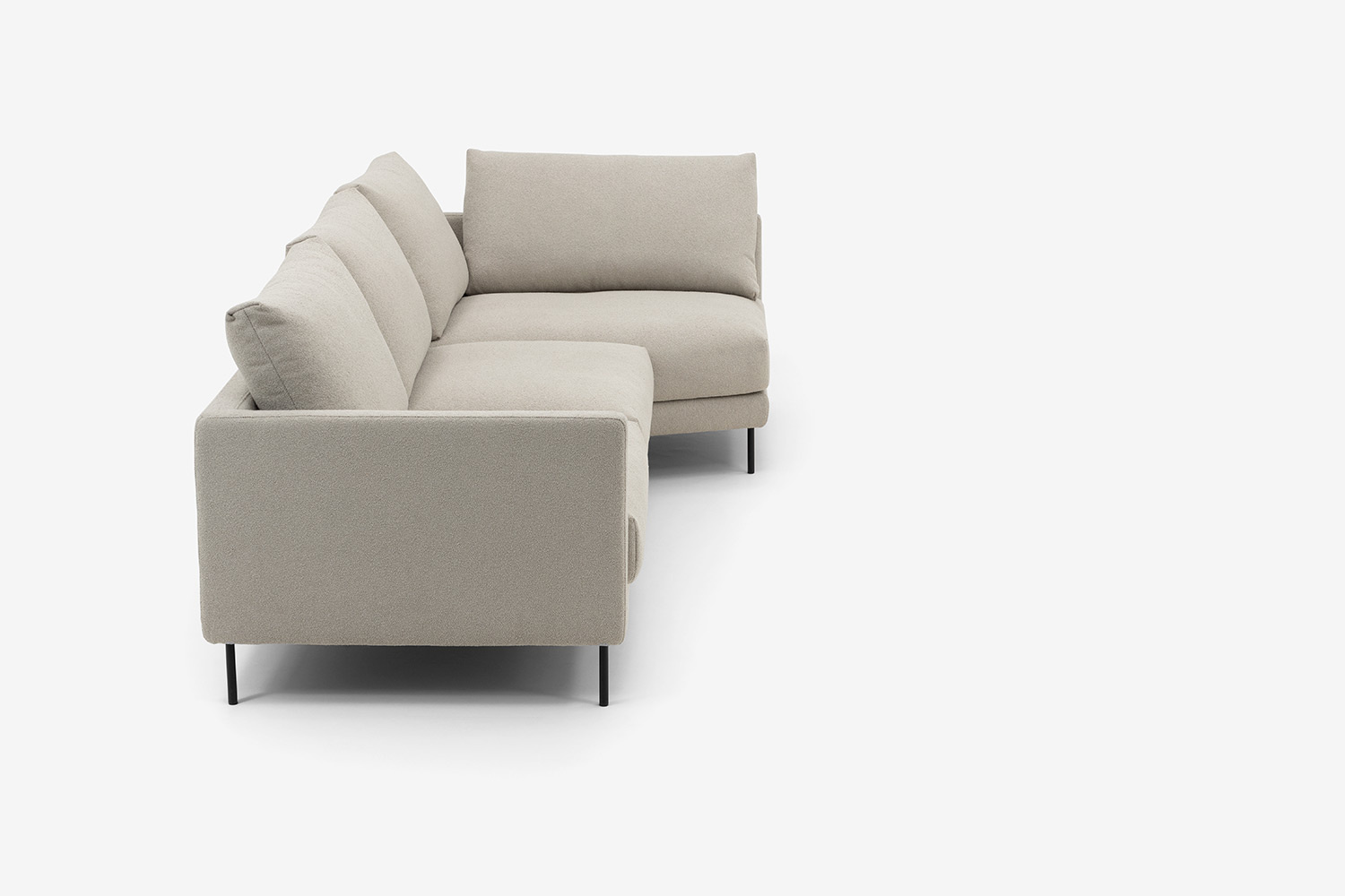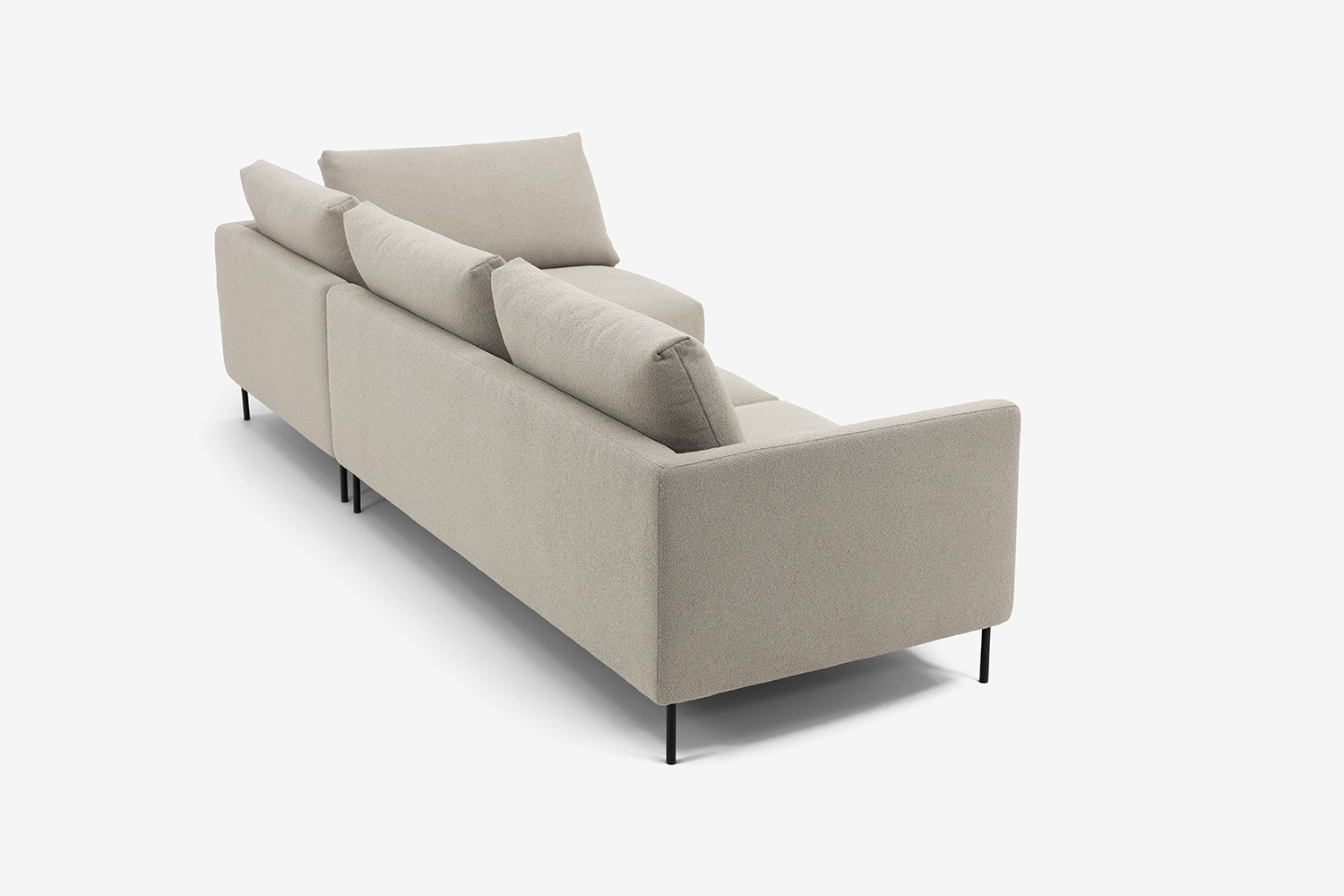 Die Beine des Ecksofas sind aus schwarzem Metall, und dank ihrer Höhe ist die Reinigung unter dem Möbel einfach und angenehm. Dies ist sehr vorteilhaft für die Einfachheit des täglichen Gebrauchs, trägt aber auch zu seiner Eleganz bei.