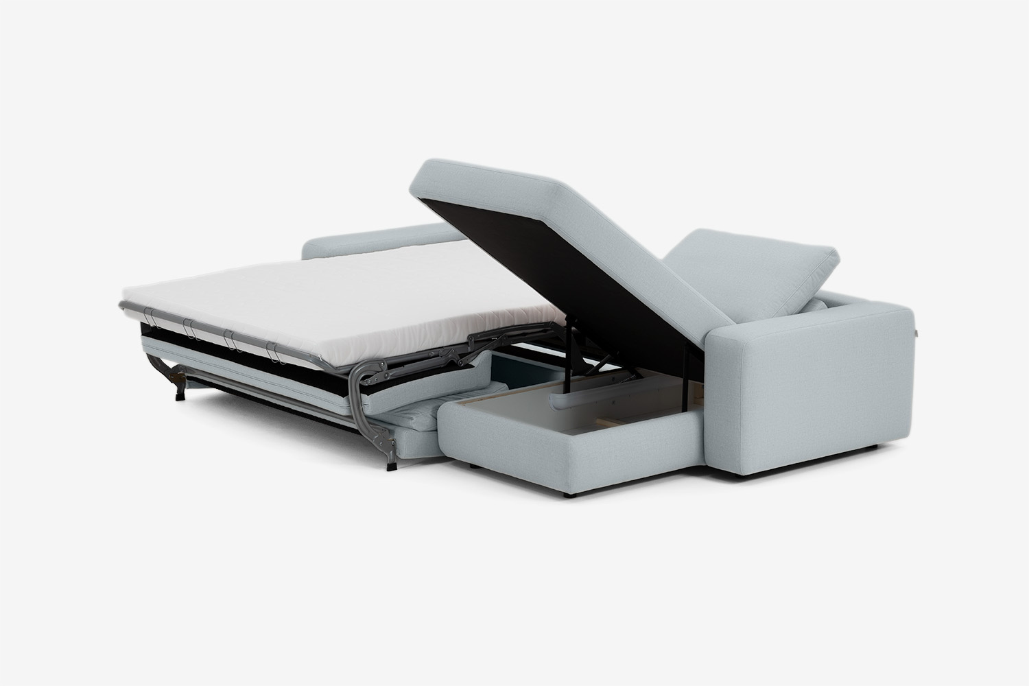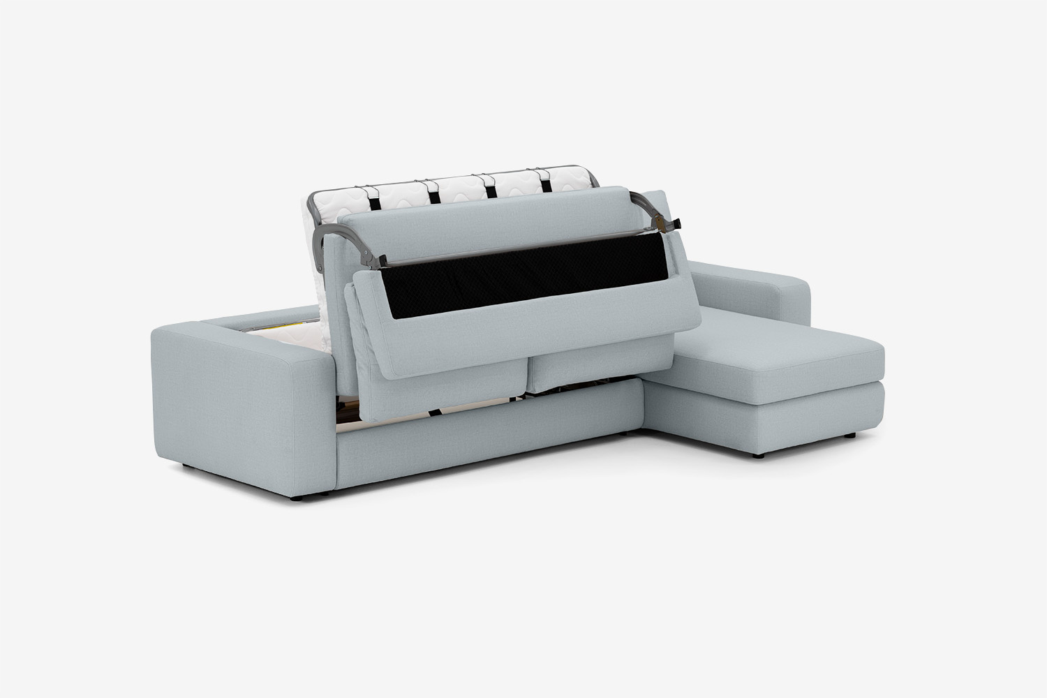Dank des italienischen Klappsystems verwandelt sich das Sofa mit einer einzigen Bewegung in ein Bett mit einer mit hochelastischem Schaumstoff gefüllten Matratze.