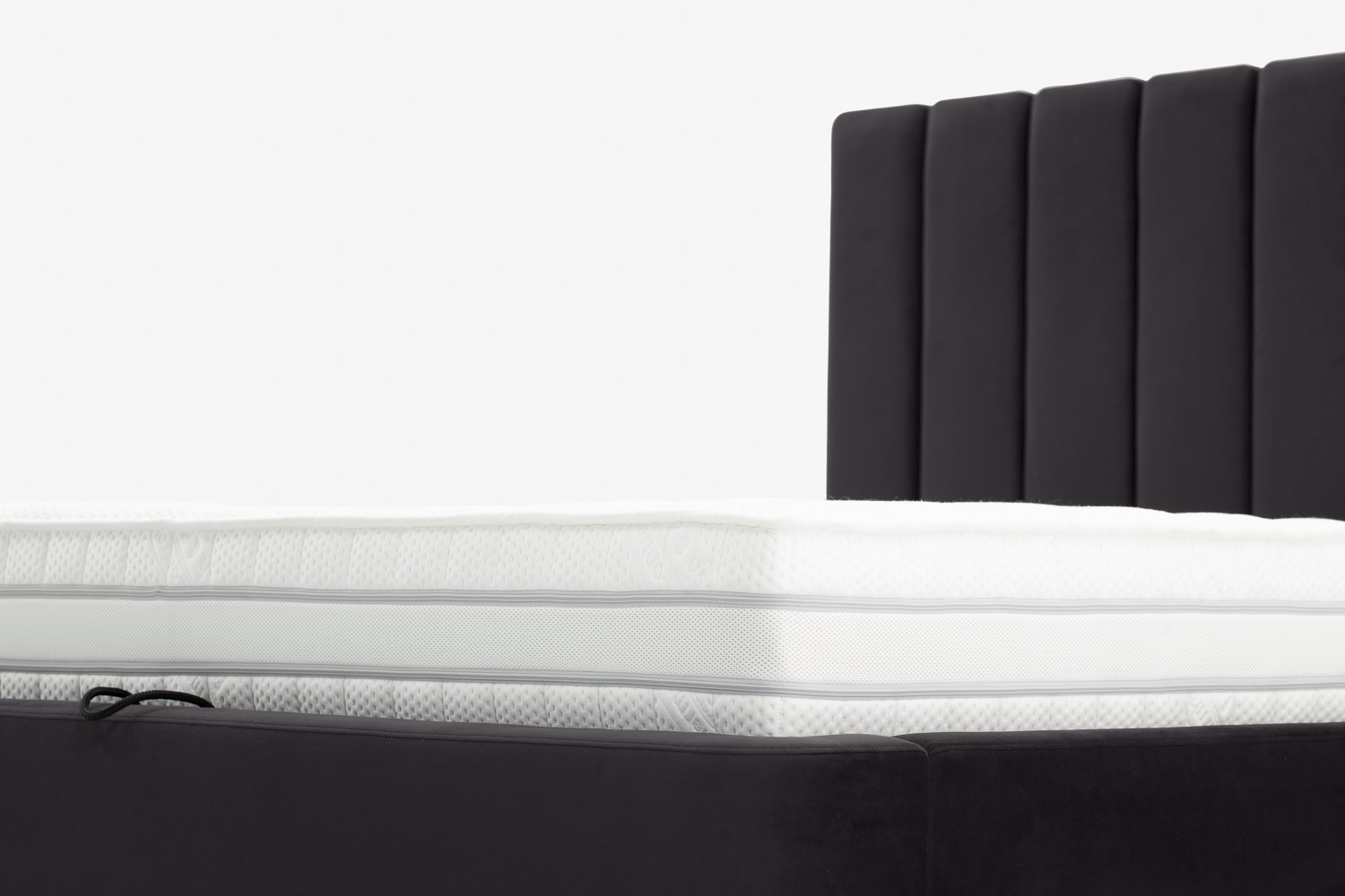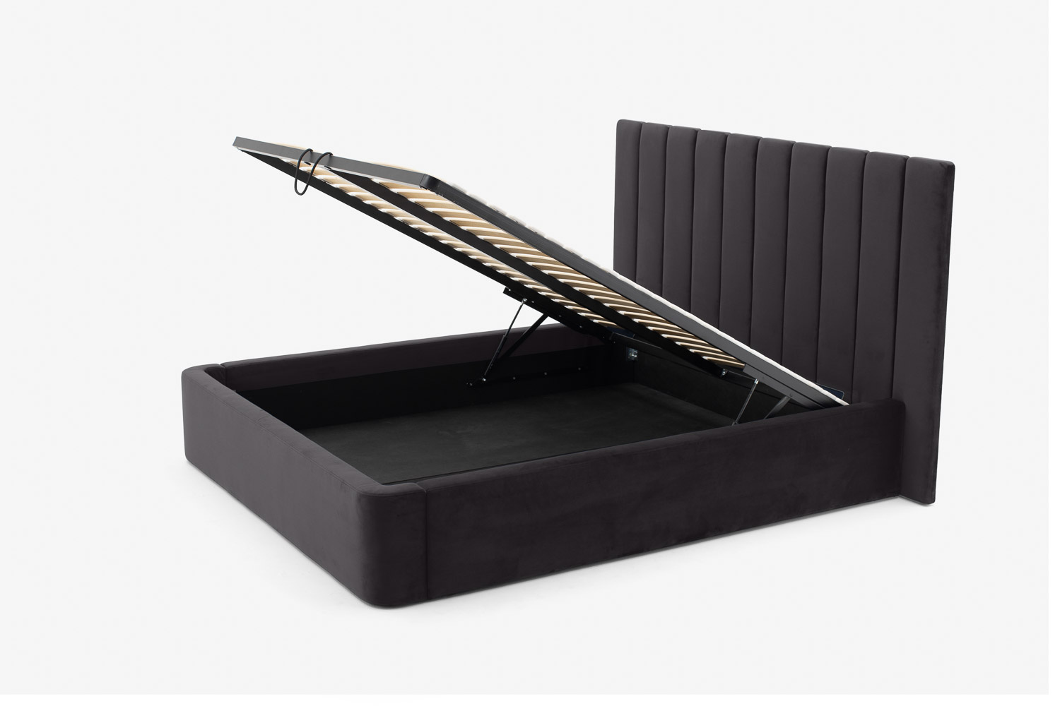 Der Vorteil des Bettes liegt in der funktionalen Nutzung des Raumes unter dem Möbel, in dem sich ein großer und geräumiger Bettzeugbehälter verbirgt.