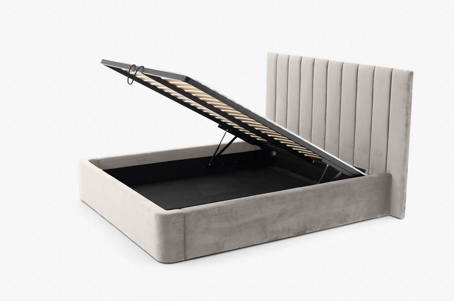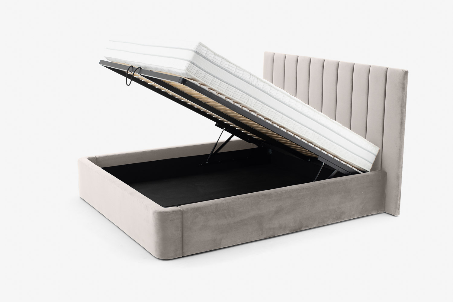 Der Vorteil des Bettes liegt in der funktionalen Nutzung des Raumes unter dem Möbel, in dem sich ein großer und geräumiger Bettzeugbehälter verbirgt.