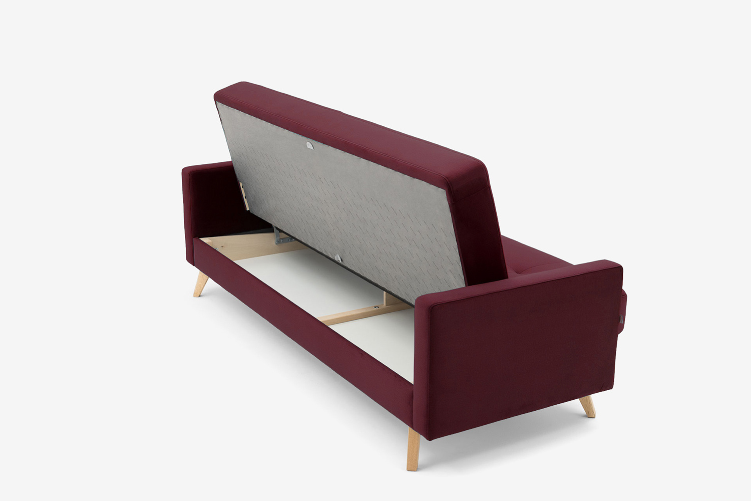 Das Scandi-Sofa ermöglicht eine maximale Raumausnutzung dank des geräumigen Bettzeugbehälters und der zweigeteilten Tasche an einer der Armlehnen.