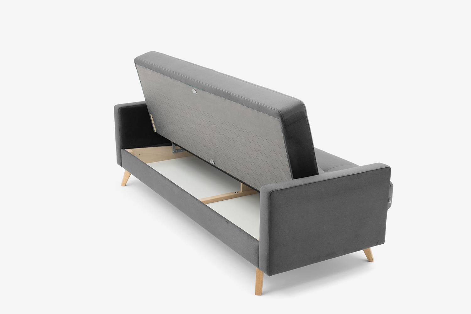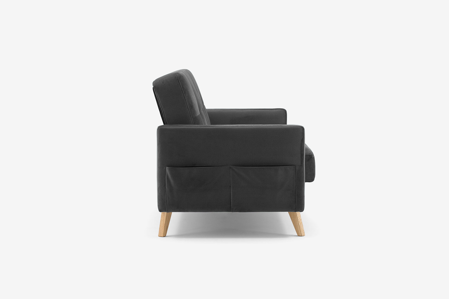 Das Scandi-Sofa ermöglicht eine maximale Raumausnutzung dank des geräumigen Bettzeugbehälters und der zweigeteilten Tasche an einer der Armlehnen.
