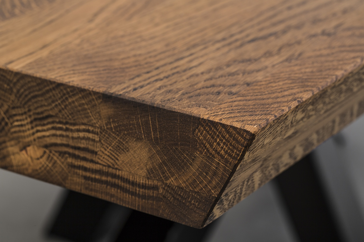 Die Tischplatte ist aus massiver Eiche gefertigt und mit natürlichem Öl-Wachs beschichtet. Diese Behandlung des Holzes garantiert eine hohe Haltbarkeit des Tisches, was sich in einer langen Funktionalität niederschlägt.
