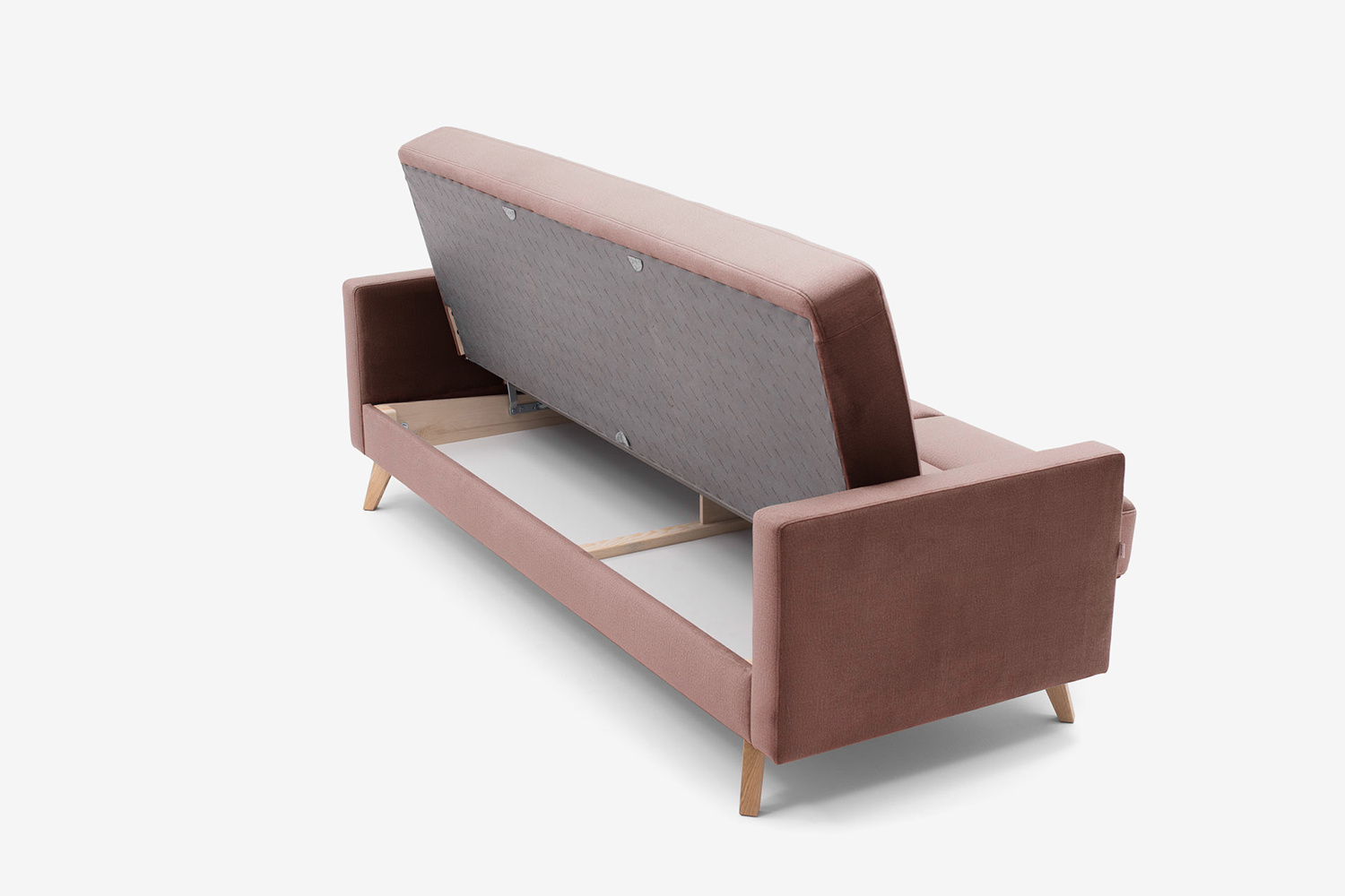 Der Vorteil des Sofas liegt in der funktionellen Nutzung des Raums unter der Sitzfläche, wo sich ein großer und geräumiger Bettzeugbehälter verbirgt.