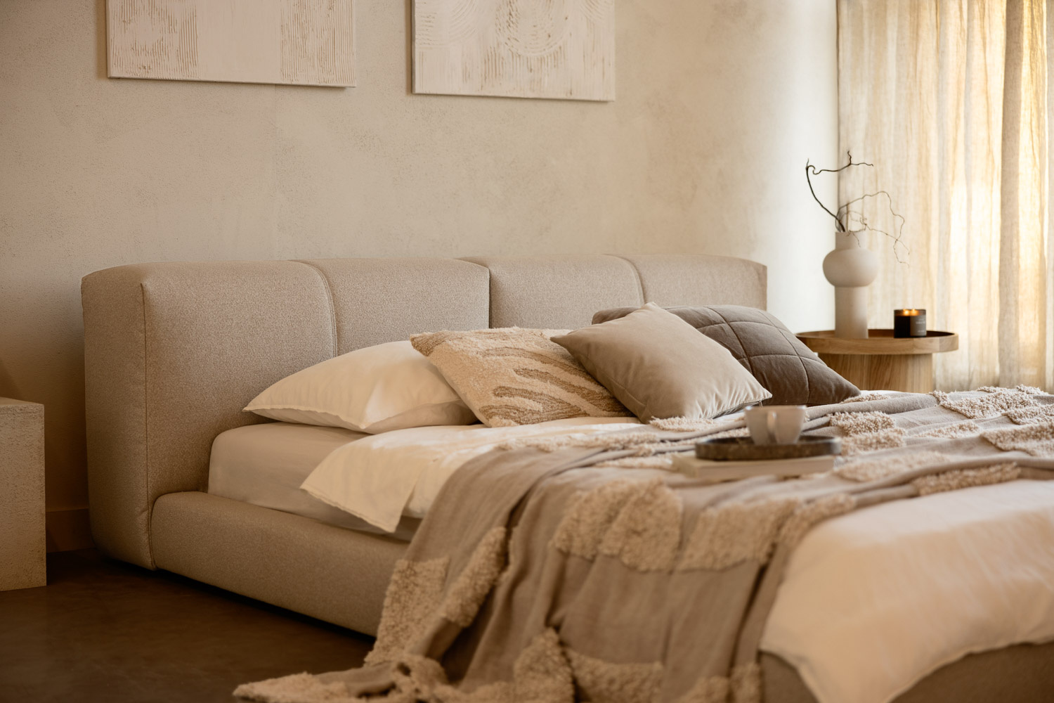 The wide headboard and the low position of the mattress are the main features of the bed and make it an original and comfortable element of the bedroom.