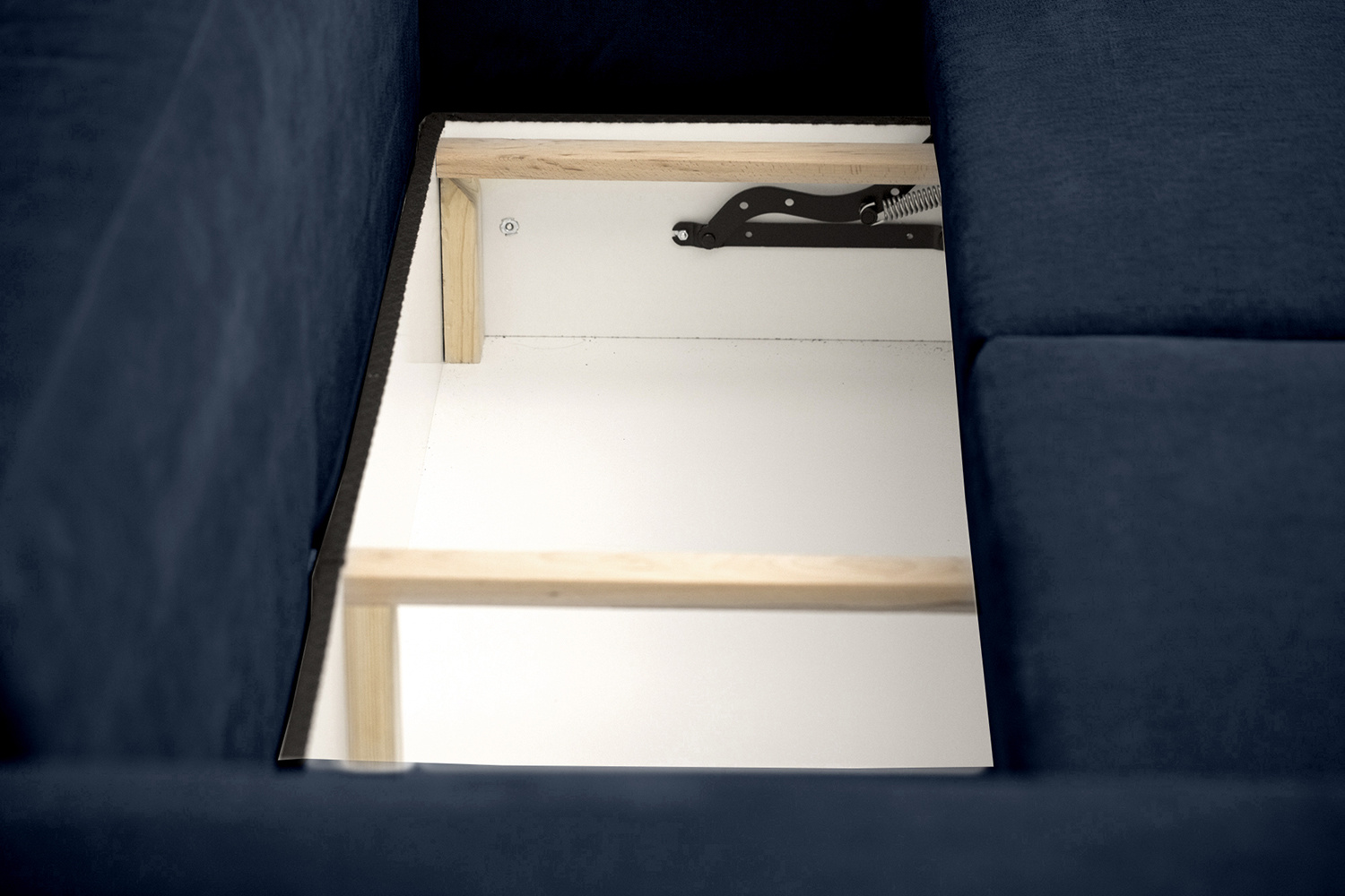 The advantage of the sofa with the DL folding system lies in the functional utilisation of the space under the seat, where a large and spacious bedding container is concealed.