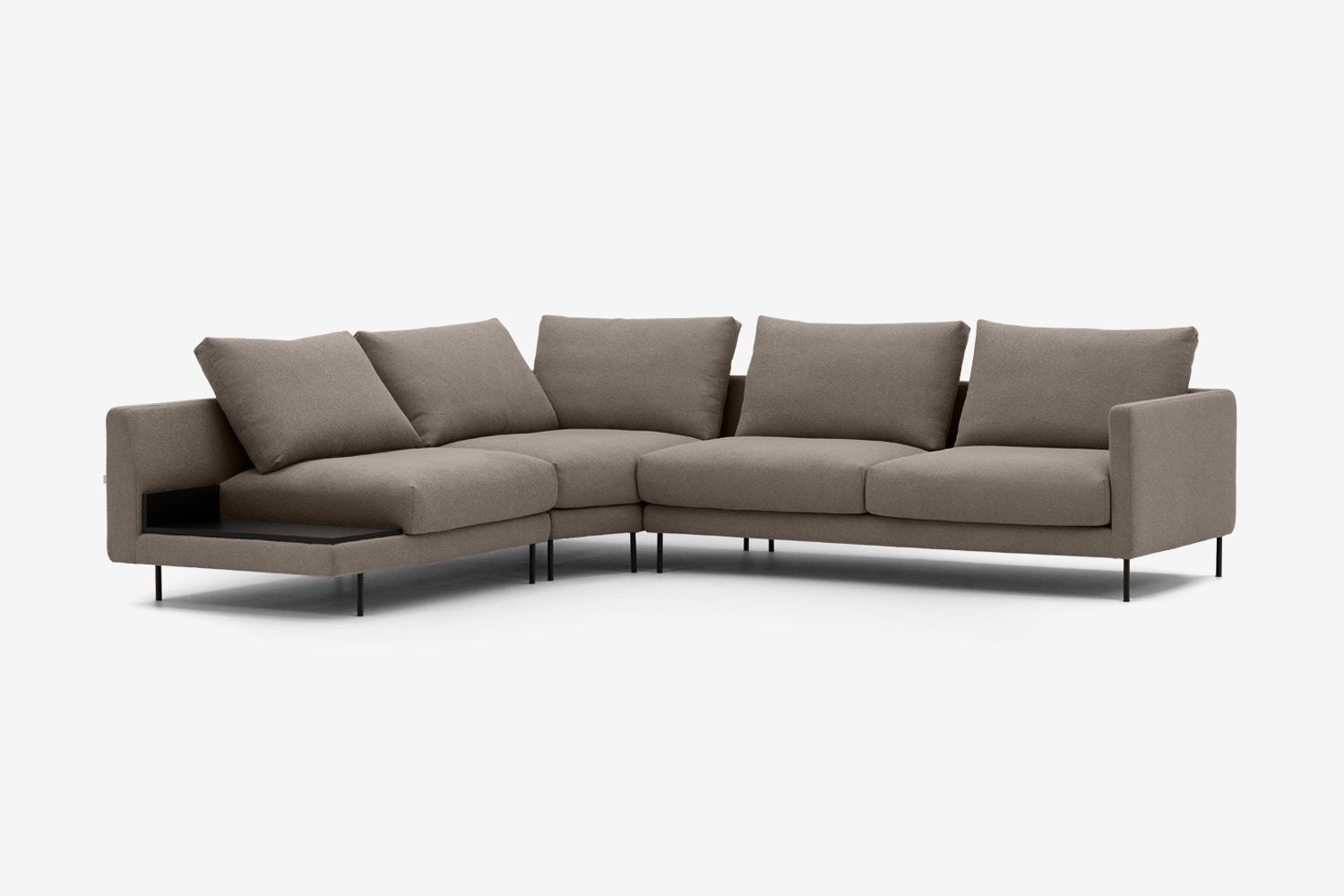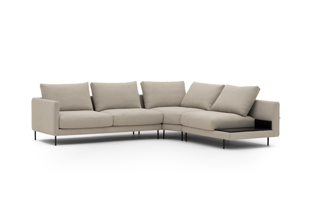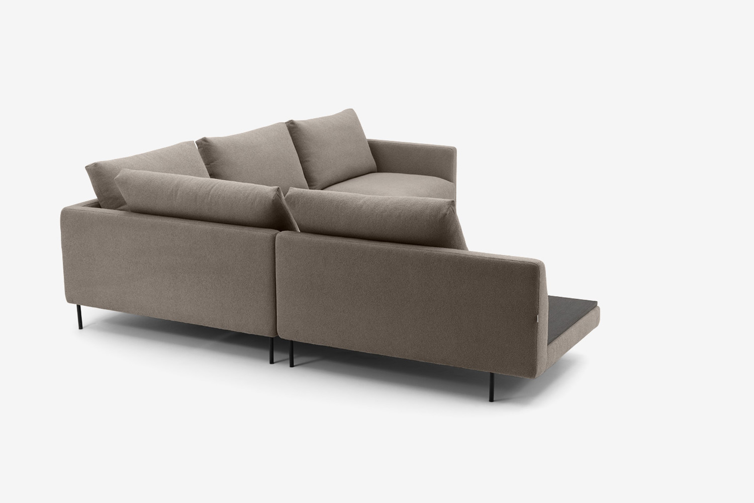 The pieces in the collection are finished with a veneered top that adds extra functionality to the corner sofa. A discreet shelf with black oak veneer is a great place to put your favourite book, laptop or coffee cup.