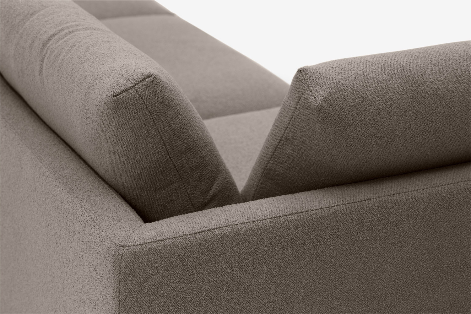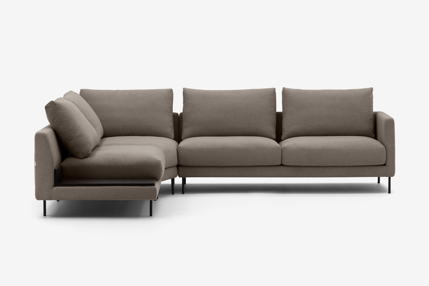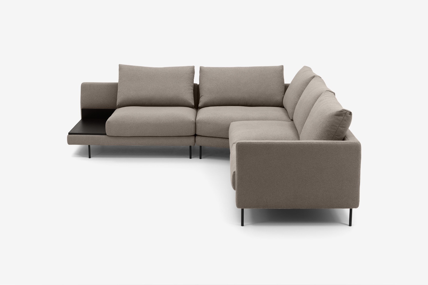 The pieces in the collection are finished with a veneered top that adds extra functionality to the corner sofa. A discreet shelf with black oak veneer is a great place to put your favourite book, laptop or coffee cup.