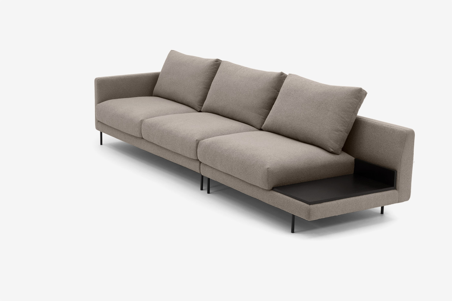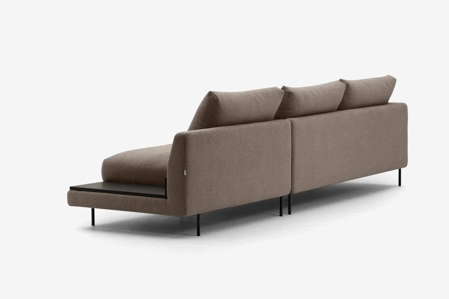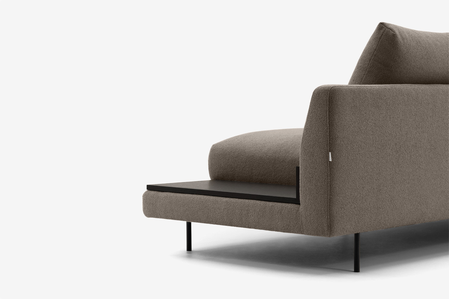 The pieces in the collection are finished with a veneered top, which gives the sofa additional functionality. A discreet shelf covered in black oak veneer provides space for your favourite book, laptop or coffee cup.