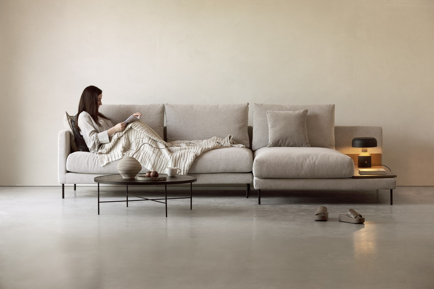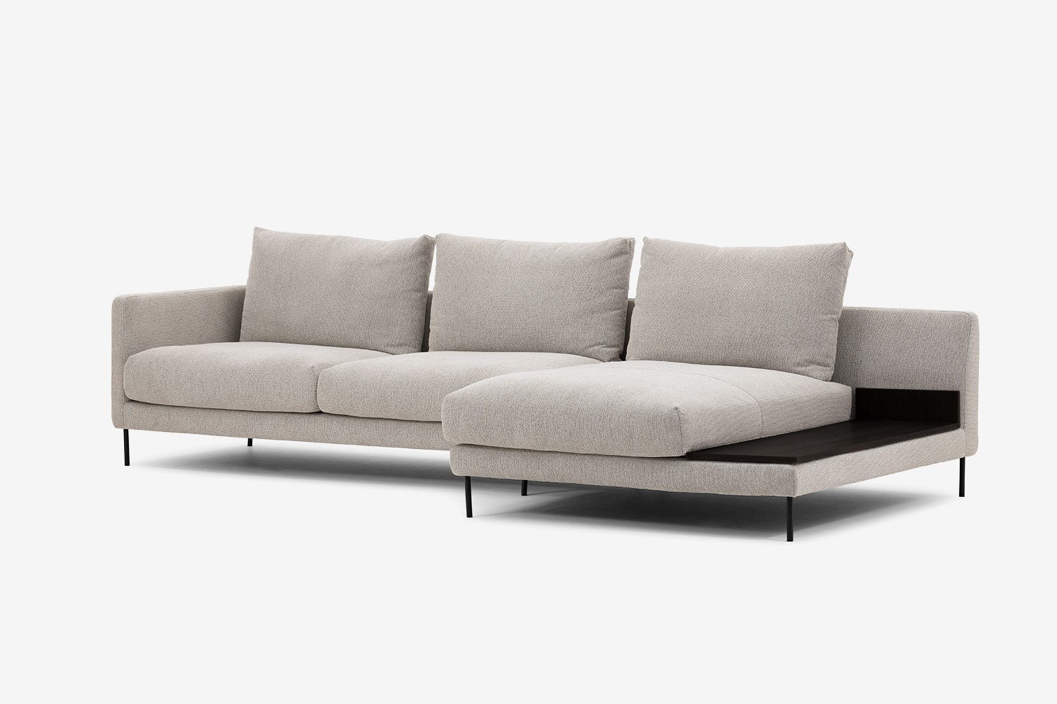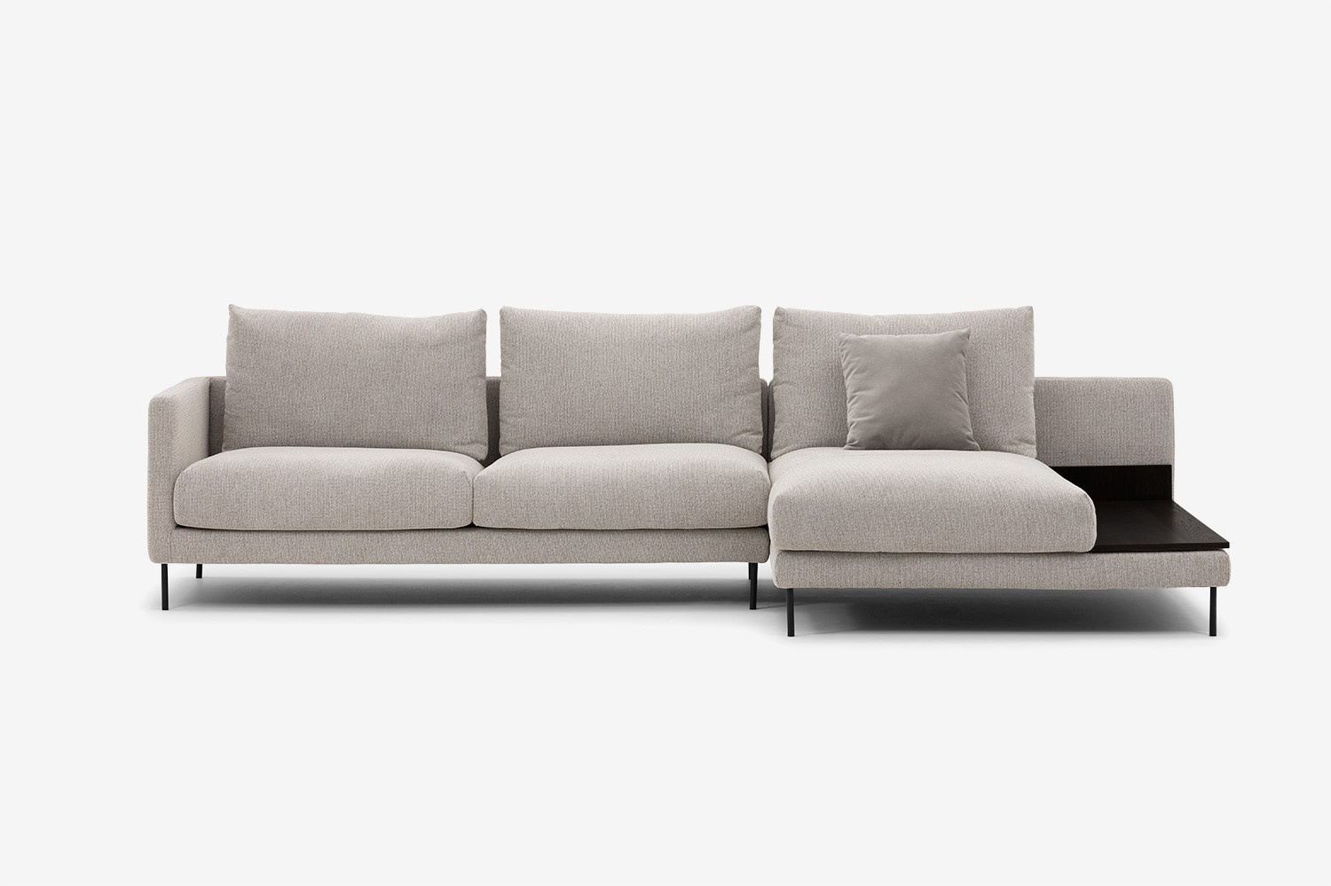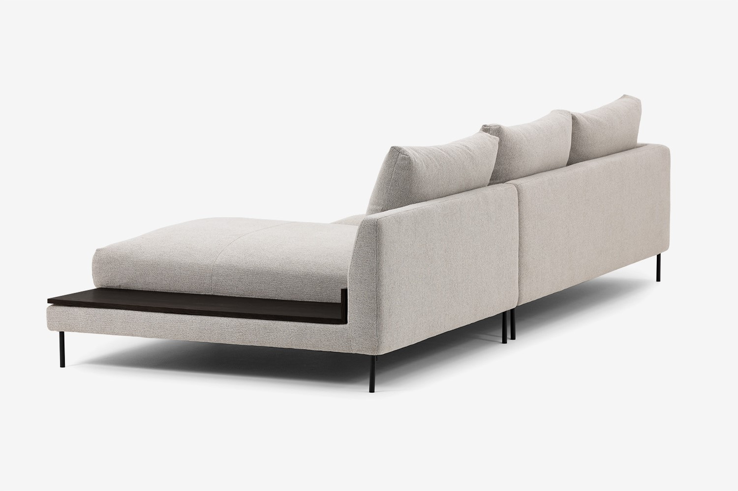 The pieces in the collection are finished with a veneered top that adds extra functionality to the corner sofa. A discreet shelf covered in black or brown oak veneer is a great place for your favourite book, laptop or coffee cup.