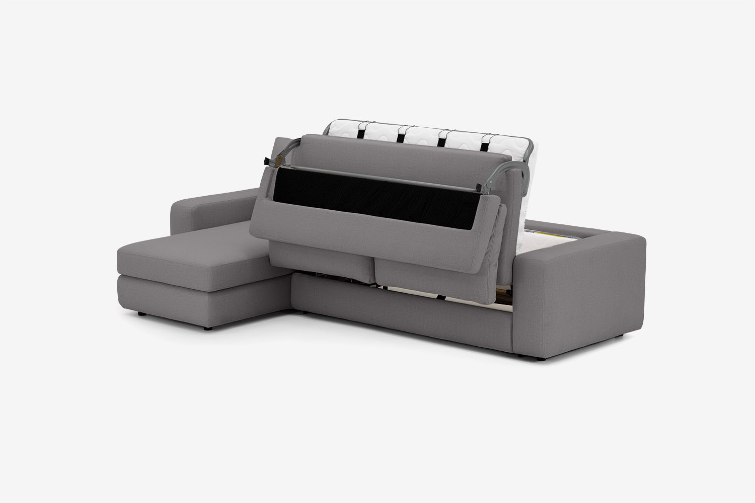 Sofa dzięki włoskiemu systemowi rozkładania jednym ruchem zamienia się w łóżko wyposażone w materac wypełniony pianką wysokoelastyczną.