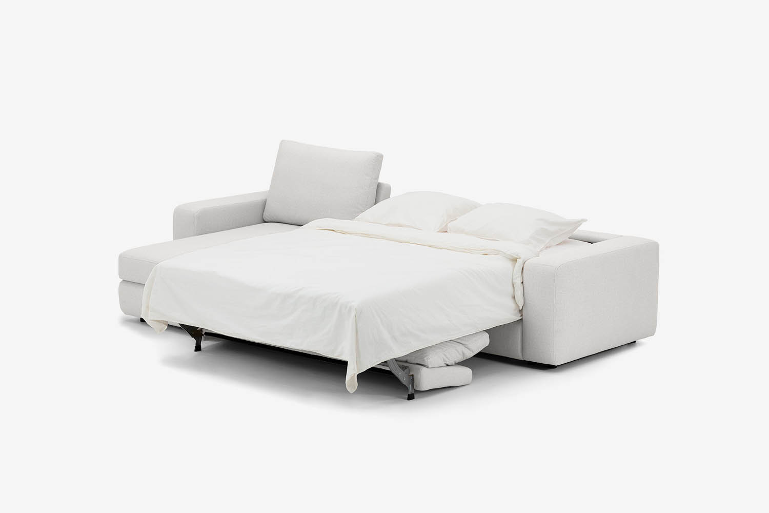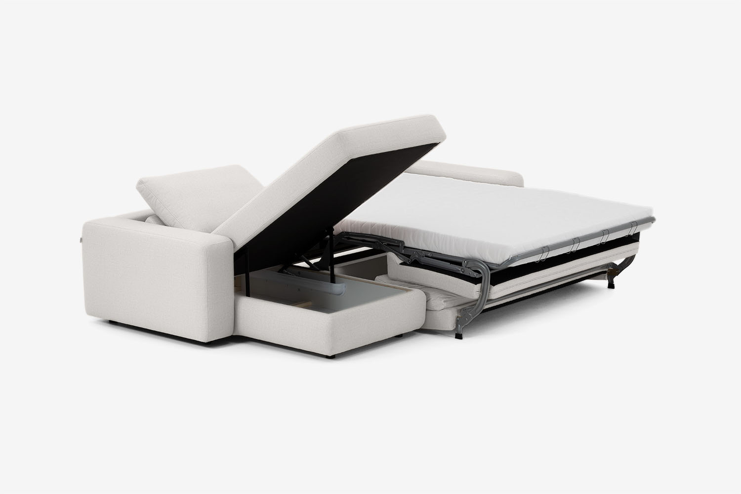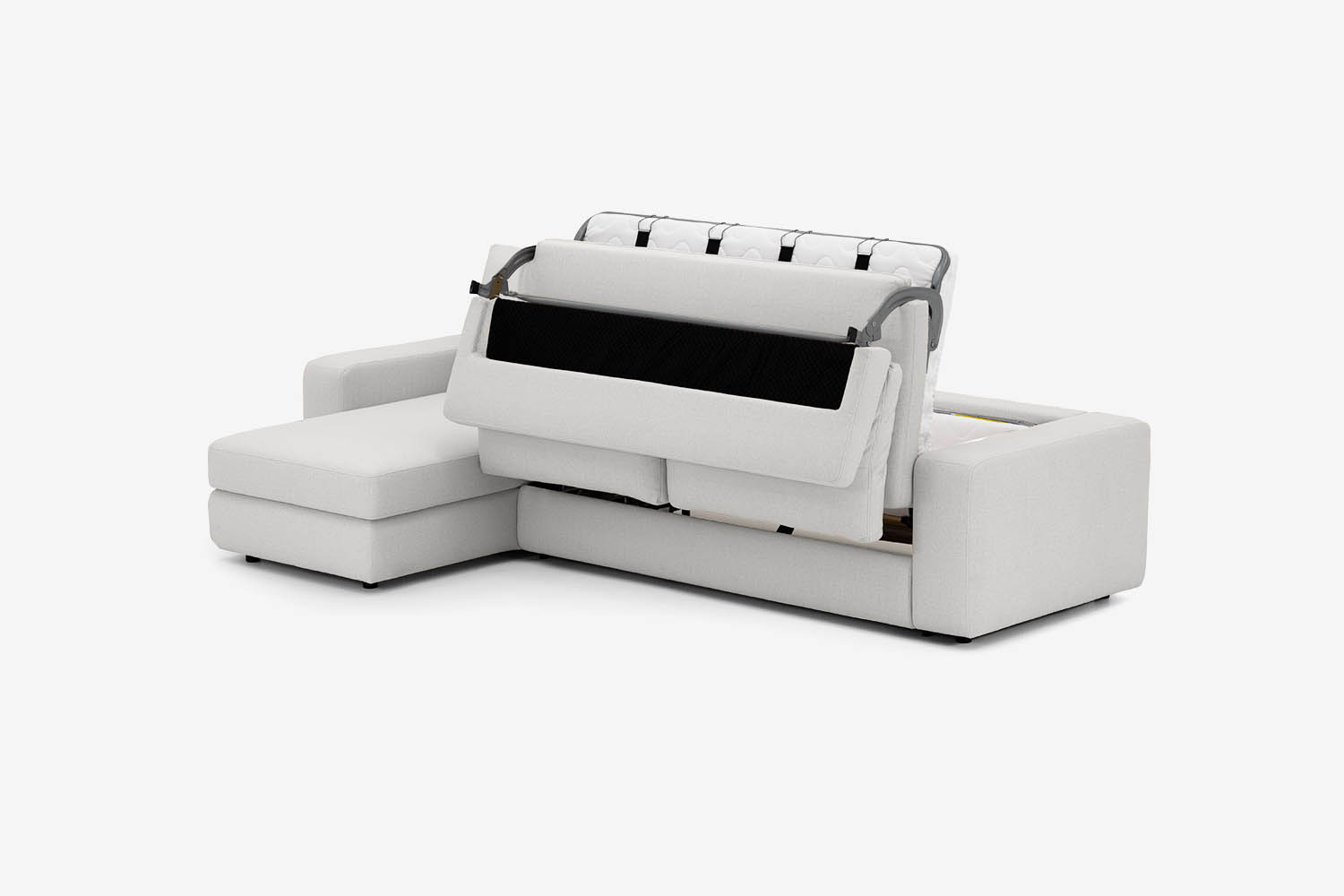 Sofa dzięki włoskiemu systemowi rozkładania jednym ruchem zamienia się w łóżko wyposażone w materac wypełniony pianką wysokoelastyczną.