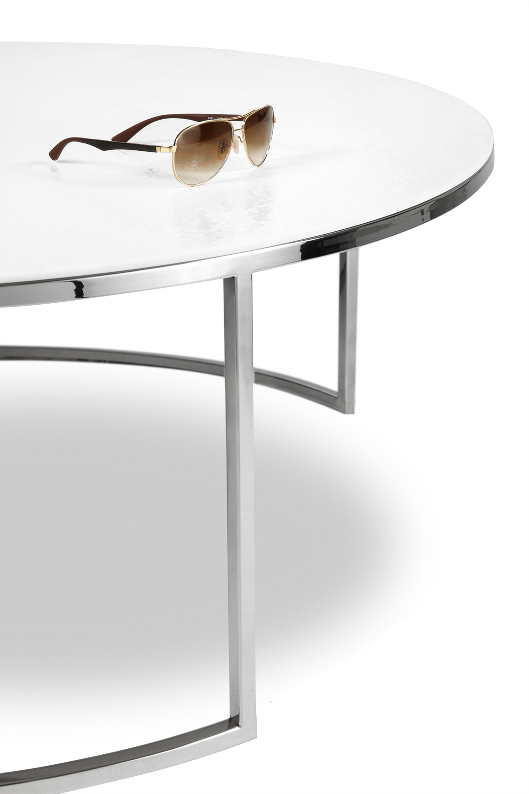 Komplet cechuje duża praktyczność użytkowania. Spójną kompozycje uzyskujemy dzięki odpowiednio dobranej i wyprofilowanej okrągłej podstawie, która w połączeniu z drugim stolikiem tworzy bardzo praktyczny zestaw, ponieważ podstawę mniejszego stolika, możemy wsunąć pod większy.