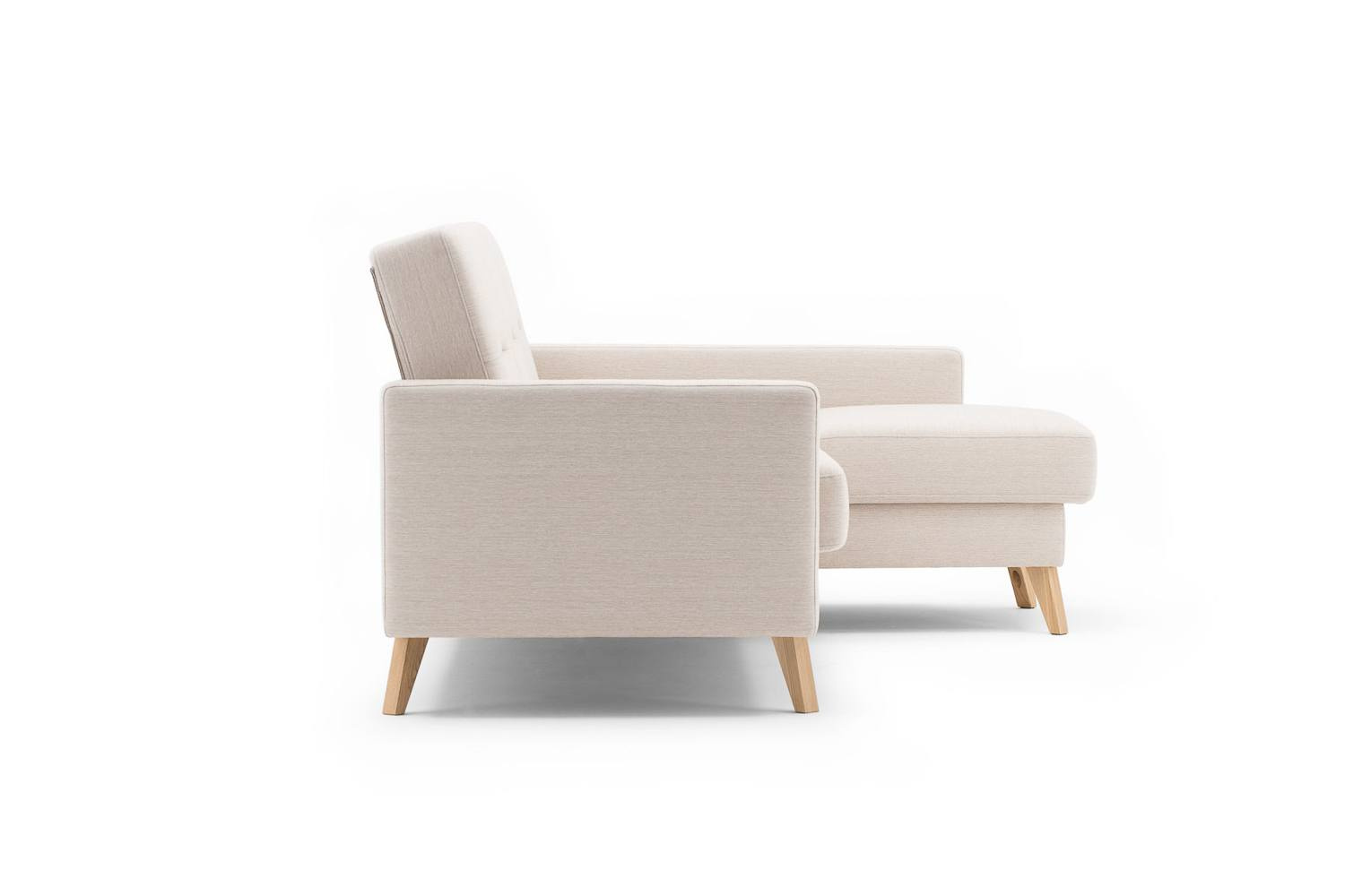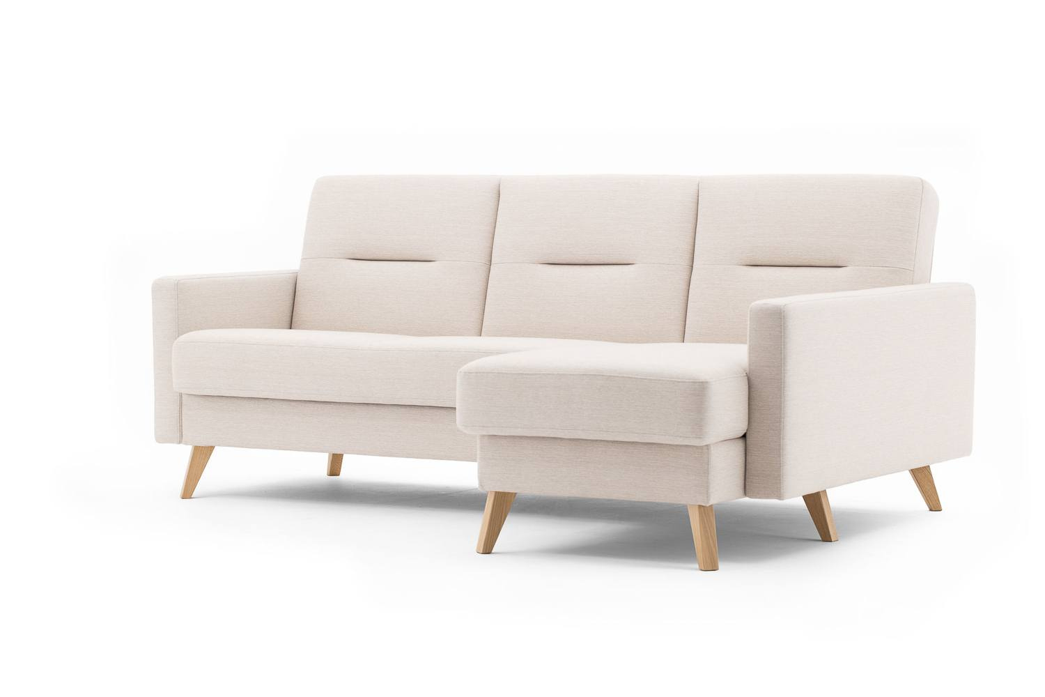 Stockholm is a light and functional corner sofa in Scandinavian style. It has a classic "clic-clac" sleeping function, a large bedding container and a container for small items. Additional functionality is added by a two-piece pocket on one of the armrests.