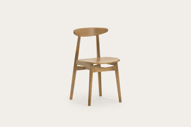 Proste drewniane nogi wraz z podstawą oraz subtelnie zaokrąglony kształt oparcia nadają krzesłu wyjątkowy charakter.