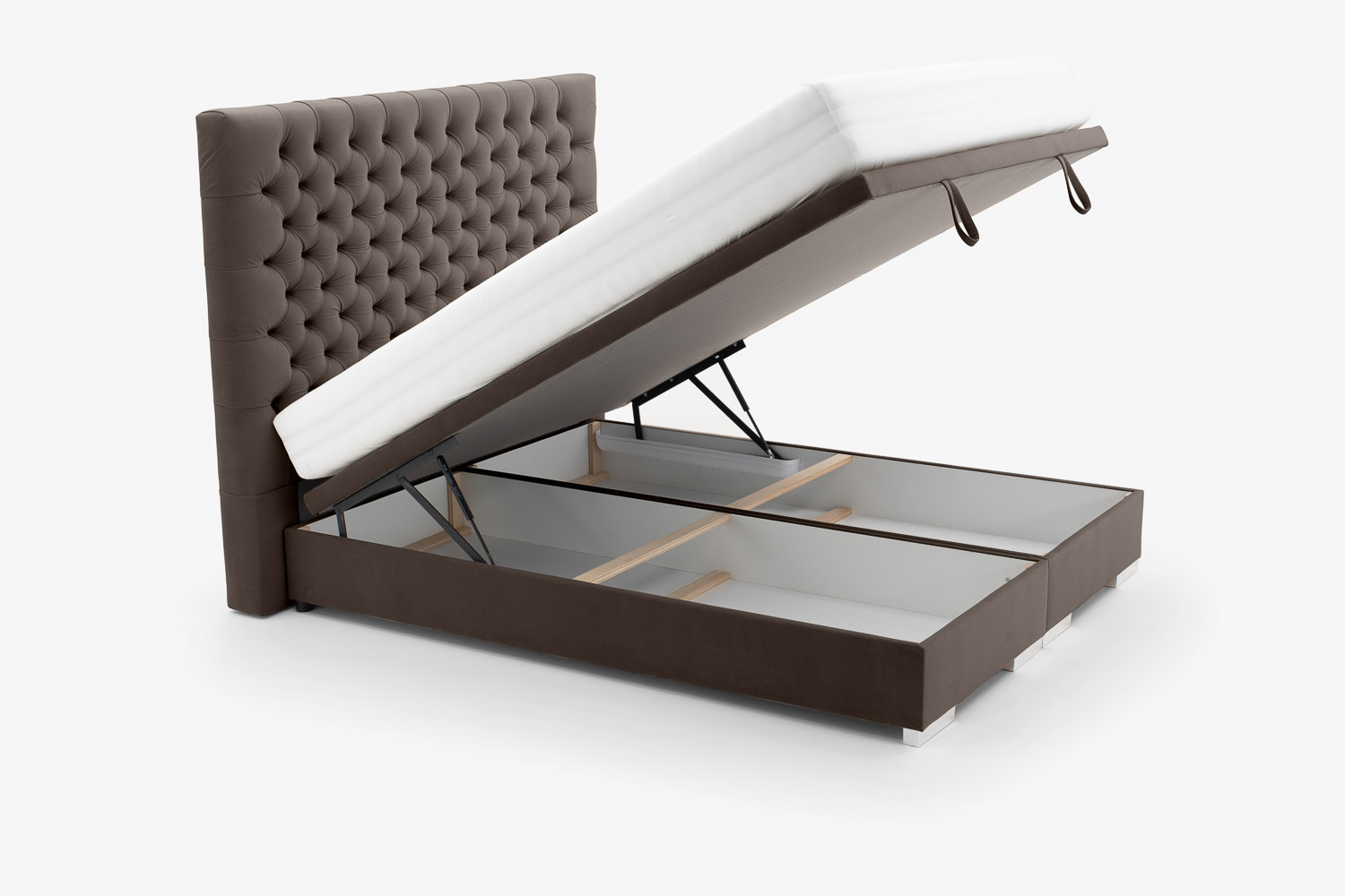 Łóżko wyposażone jest w duży pojemnik na pościel który jest otwierany na wysięgnikach gazowych. Zaletą łóżka kontynentalnego jest to że nie posiada ramy bocznej więc nie ma tu twardych, drewnianych krawędzi.