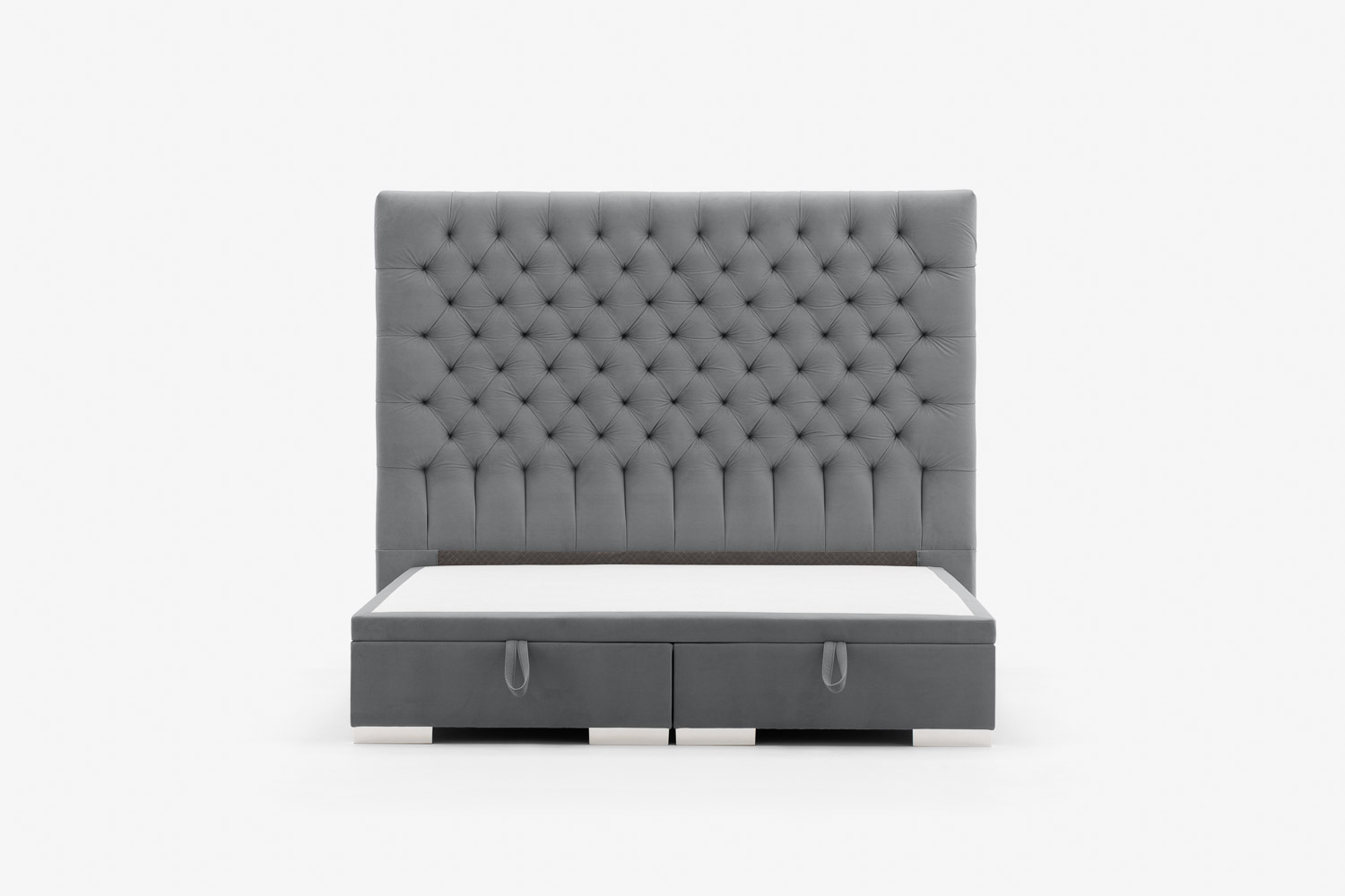 Łóżko wyposażone jest w duży pojemnik na pościel który jest otwierany na wysięgnikach gazowych. Zaletą łóżka kontynentalnego jest to że nie posiada ramy bocznej więc nie ma tu twardych, drewnianych krawędzi.