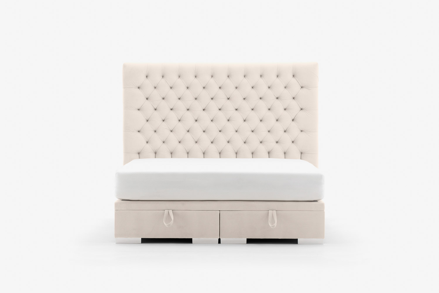 Łóżko wyposażone jest w duży pojemnik na pościel który jest otwierany na wysięgnikach gazowych. Zaletą łóżka kontynentalnego jest to że nie posiada ramy bocznej więc nie ma tu twardych, drewnianych krawędzi.