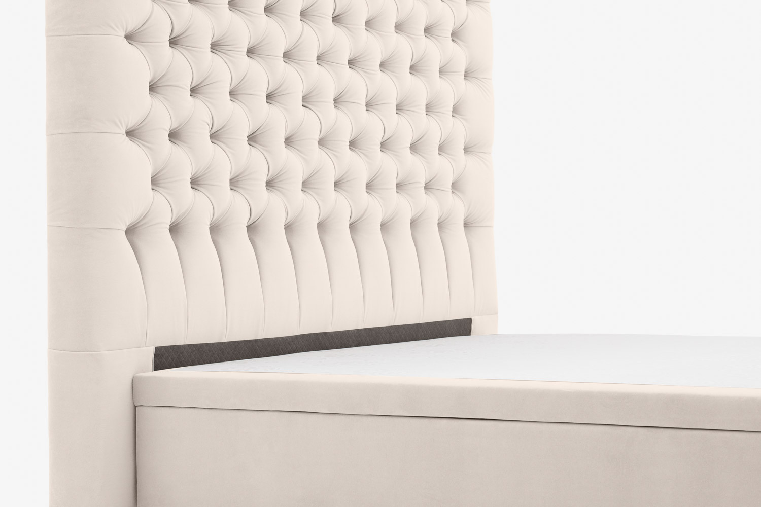 Zastosowanie dekoracyjnego pikowania na wezgłowiu, które dodatkowo zdobią symetrycznie rozmieszczone guziki podkreśla jego kształt, dodając meblu charakteru.