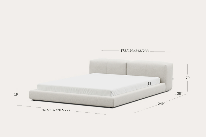 Szerokie wezgłowie wraz z niskim położeniem materaca stanowią główne cechy łóżka, pozostawiając je oryginalnym i wygodnym elementem sypialni.