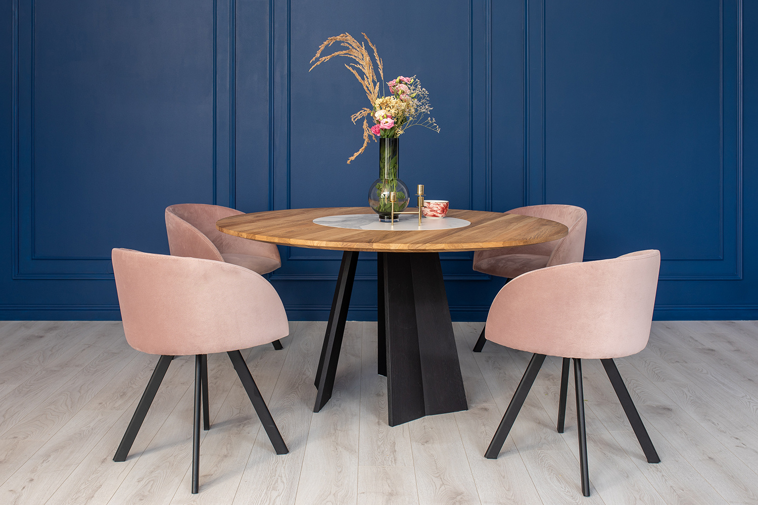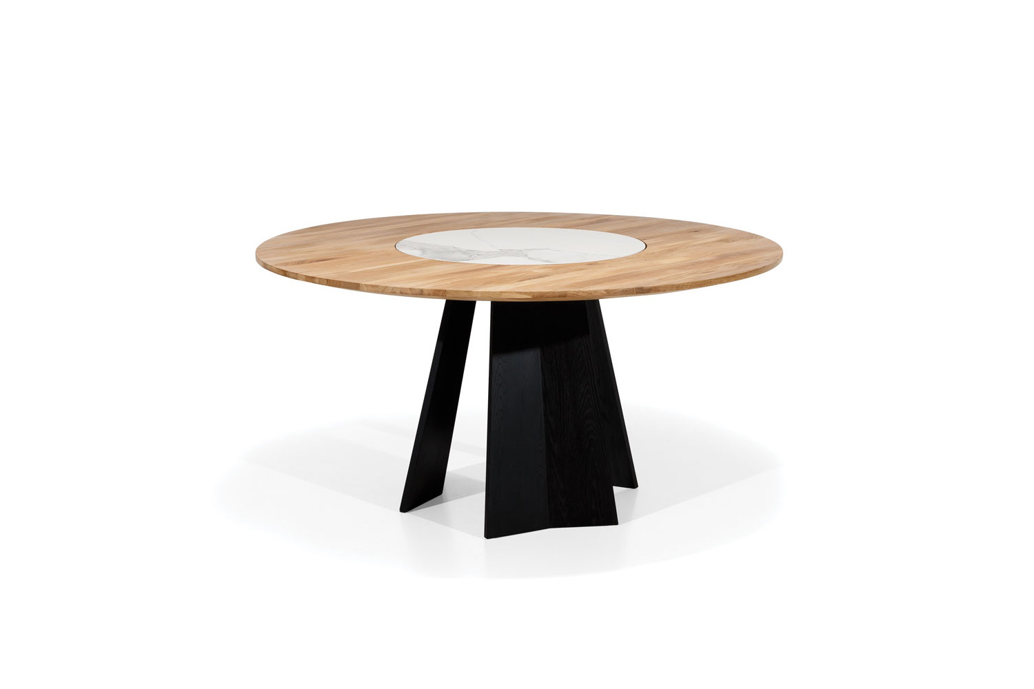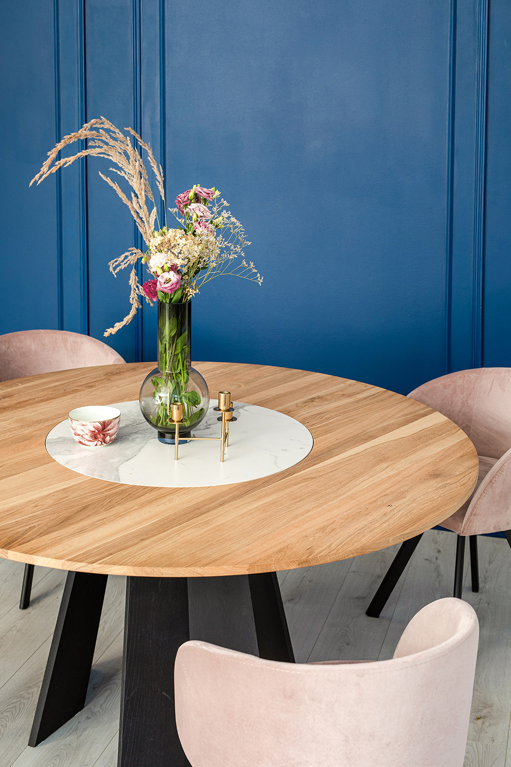 blat stołu wykonany z litego dębu i pokryty naturalnym olejowoskiem, spiek kwarcowy z funkcją obrotową