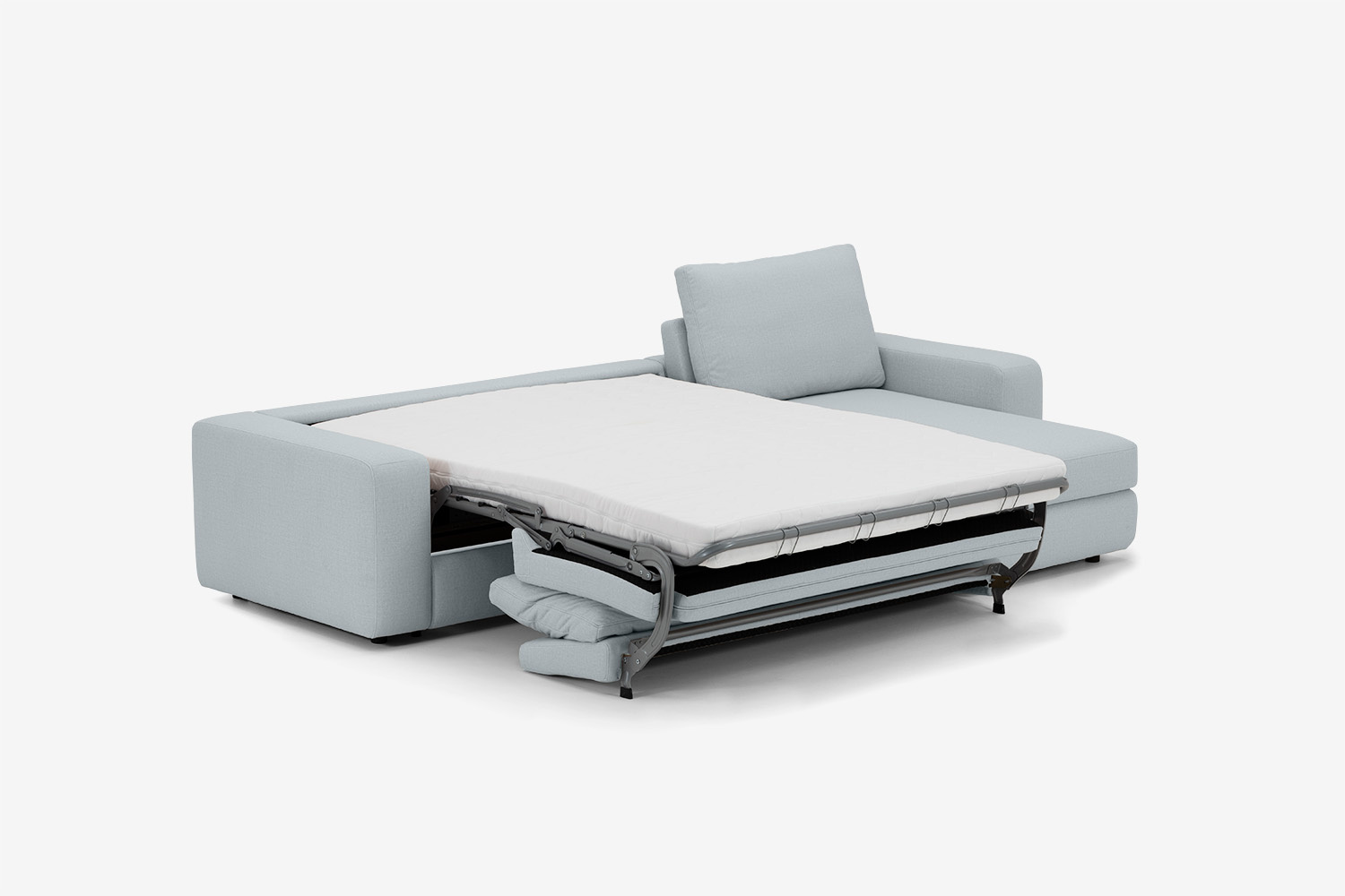 Sofa dzięki włoskiemu systemowi rozkładania jednym ruchem zamienia się w łóżko wyposażone w materac wypełniony pianką wysokoelastyczną.