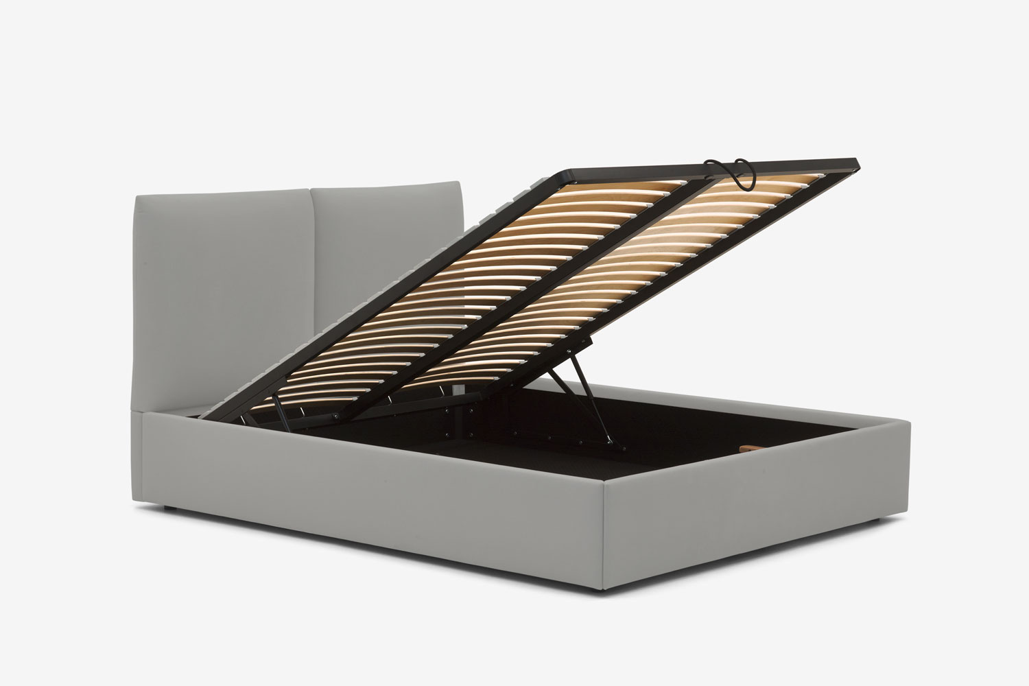 Zaletą łóżka jest funkcjonalne wykorzystanie przestrzeni pod meblem, gdzie kryje się duży i pojemny schowek na pościel.